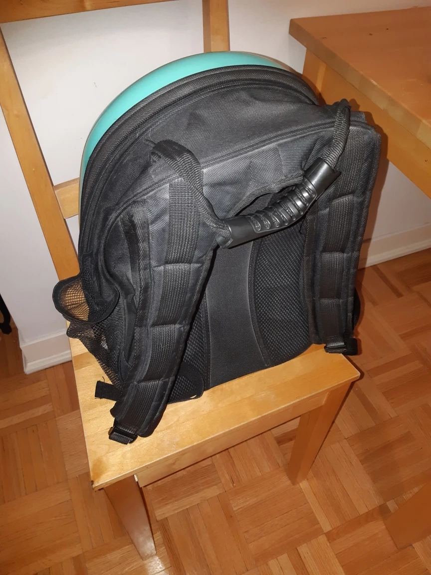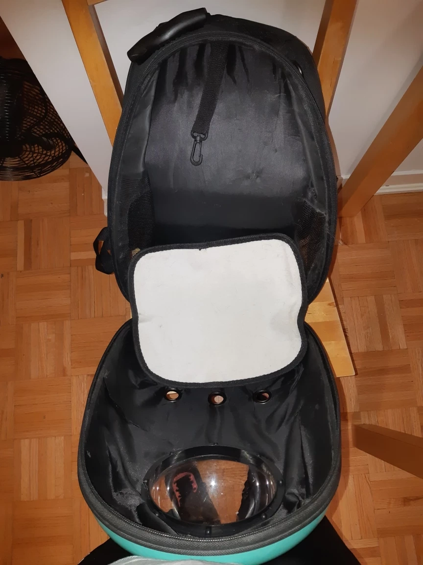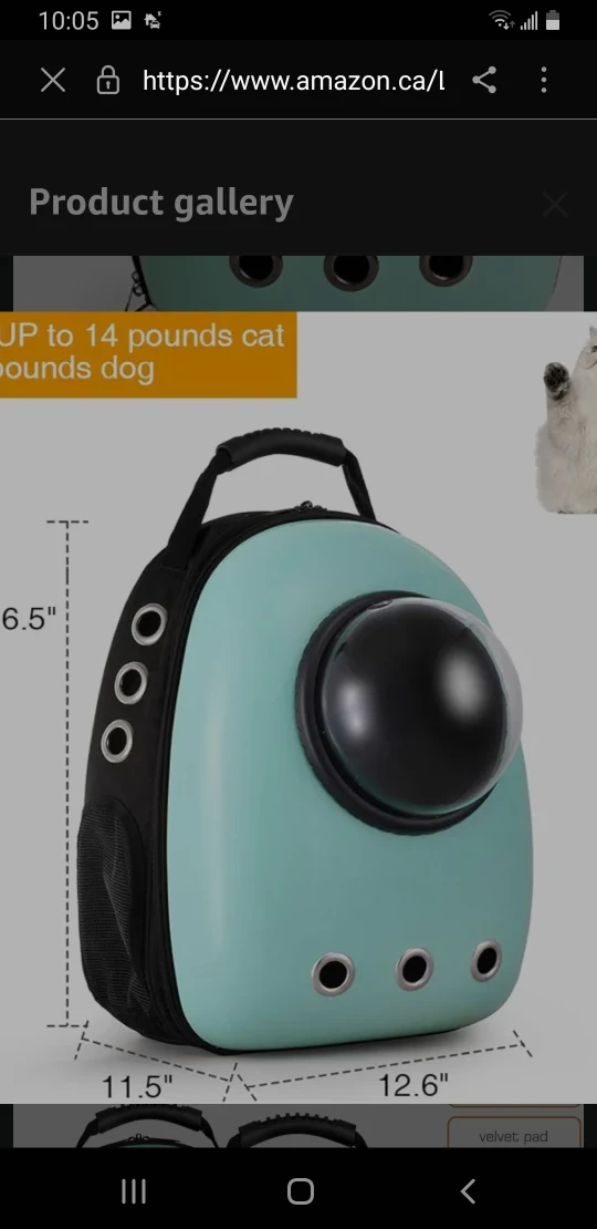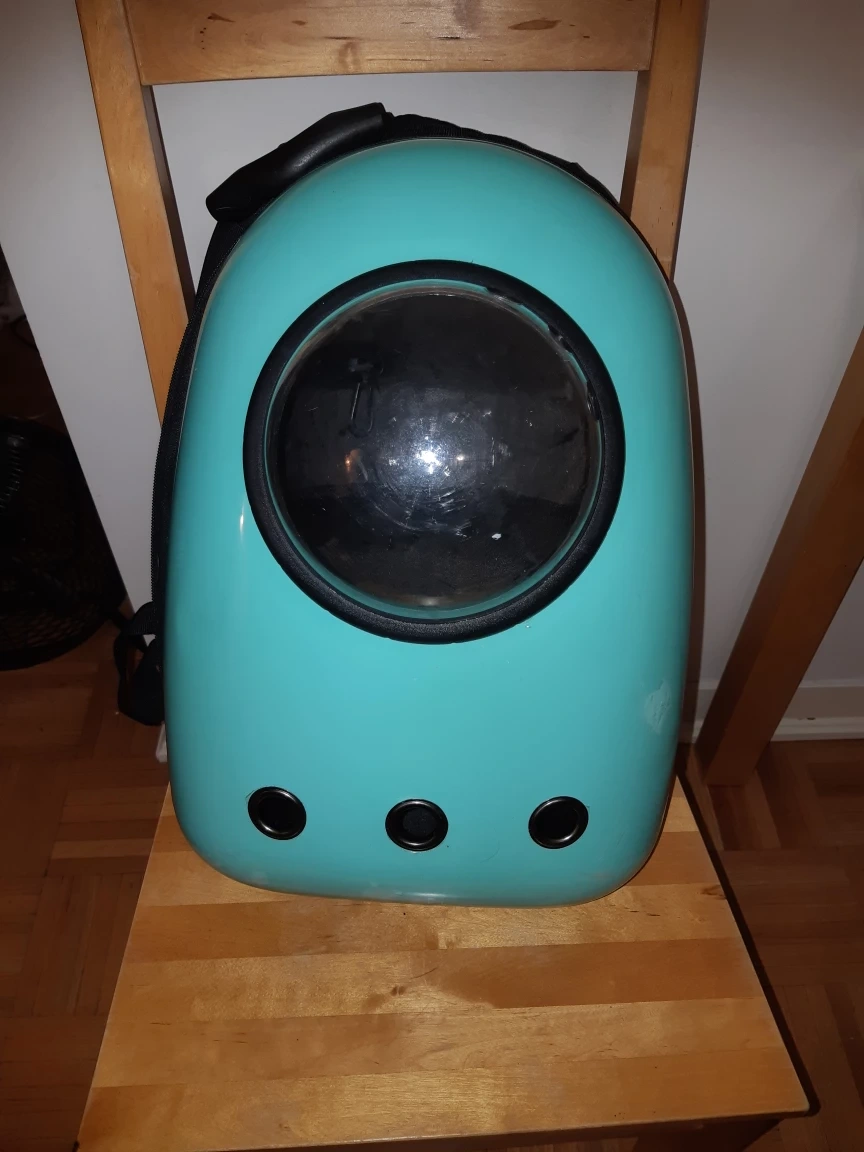 This is a super cute pet carrier backpack! It's designed with a space capsule bubble window for your furry friend to enjoy the scenery. It's mint green and black, perfect for cats or small dogs up to 14 pounds. The dimensions are approximately 16.5" x 12.6" x 11.5".