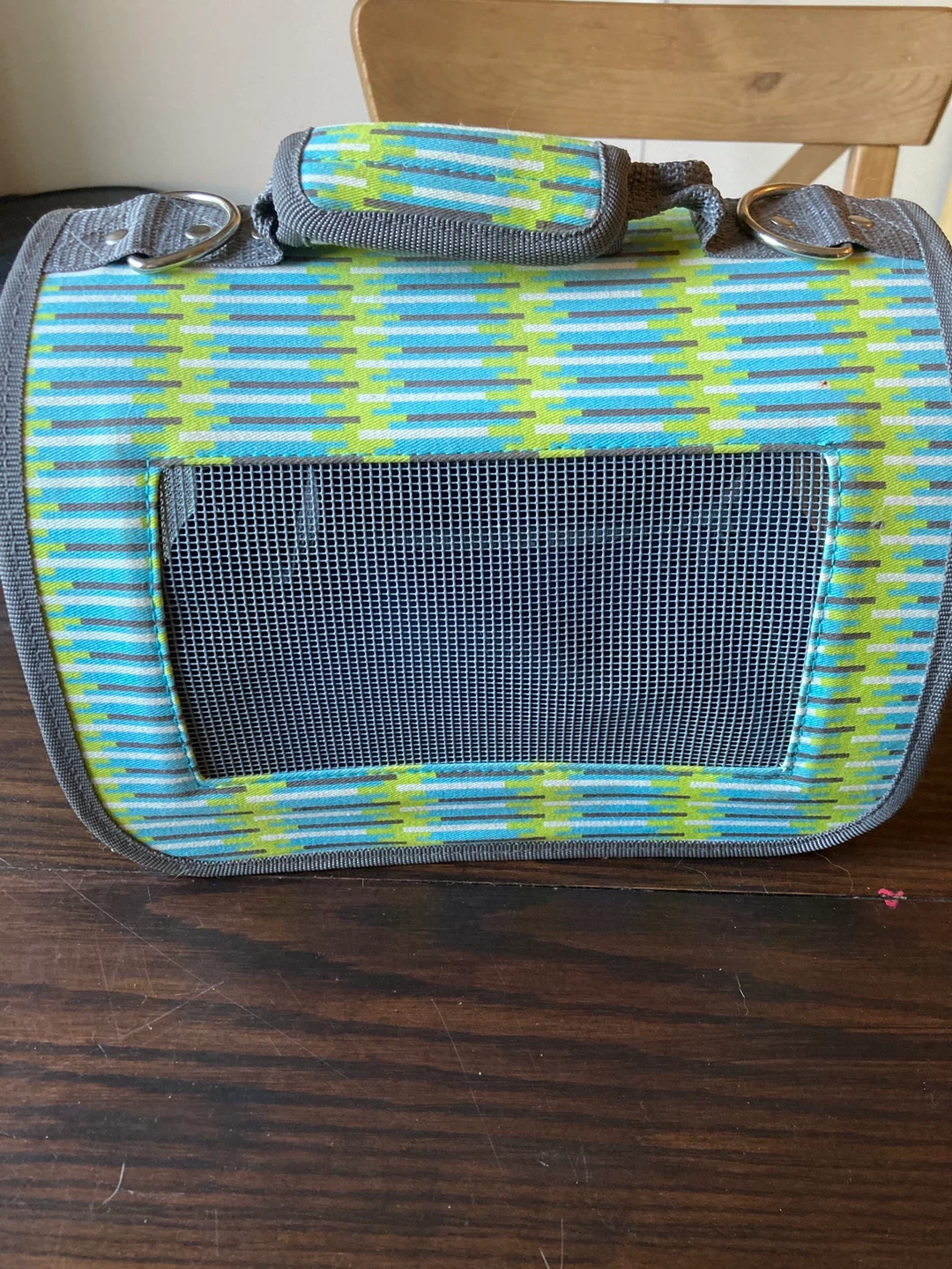 Pet carrier in great condition! It's blue and green with a striped pattern and mesh windows for ventilation. Perfect for small animals, gerbil, guinea pig, budgie. There is no carrying strap.