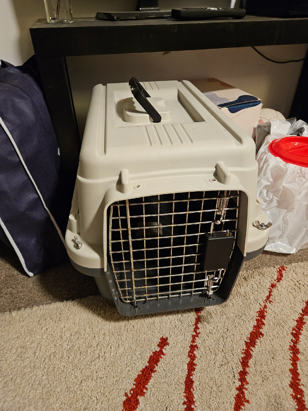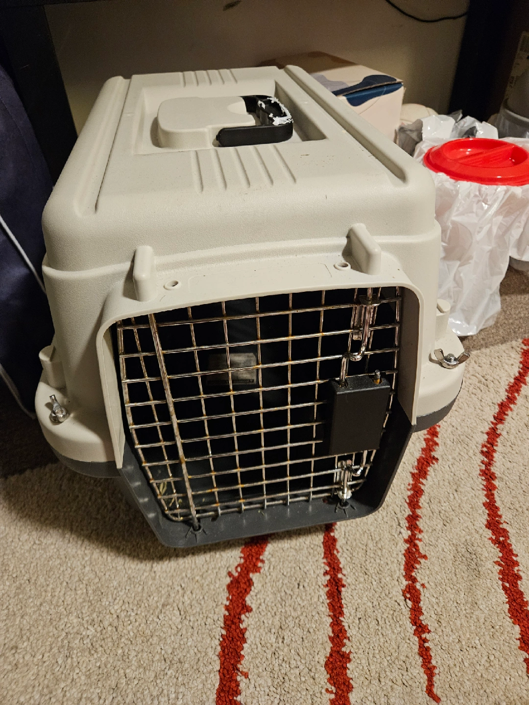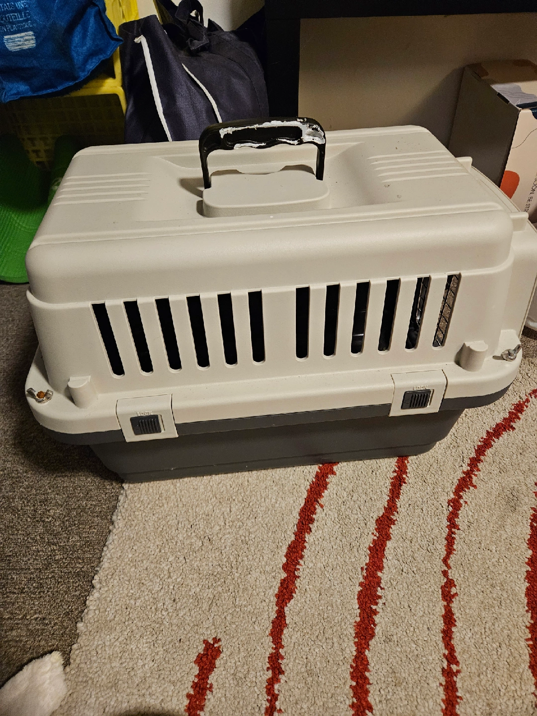 Clean pet carrier in good condition. Perfect size for a cat or small animal. i used it for my pet bunny. Great for transporting your furry friend safely, comfortably in a sturdy and reliable carrier for your pet's travel needs.