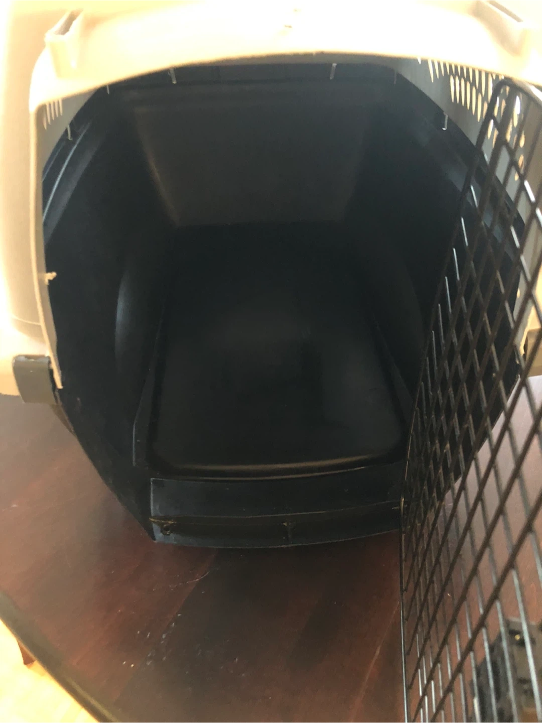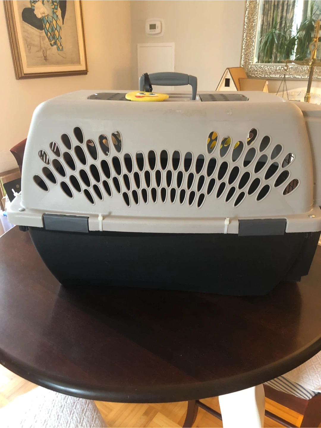 Pet carrier in grey and black, front loading, perfect for vet visits or travel. It's in good condition and ready for a new furry friend! Small/medium dogs Length 28” - 71 cm Width 17” - 43cm Height 16” - 41 cm