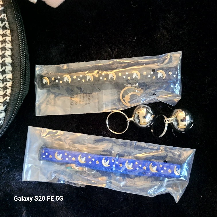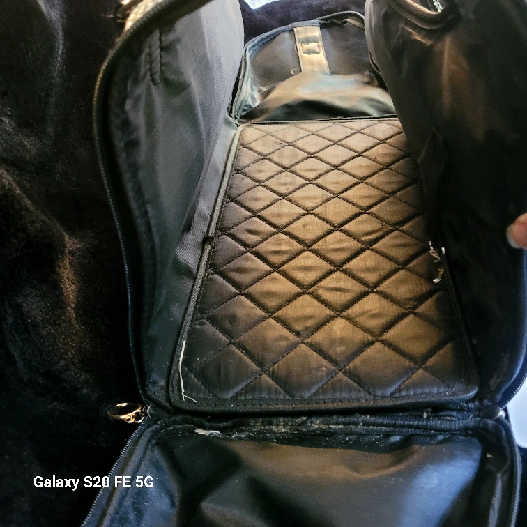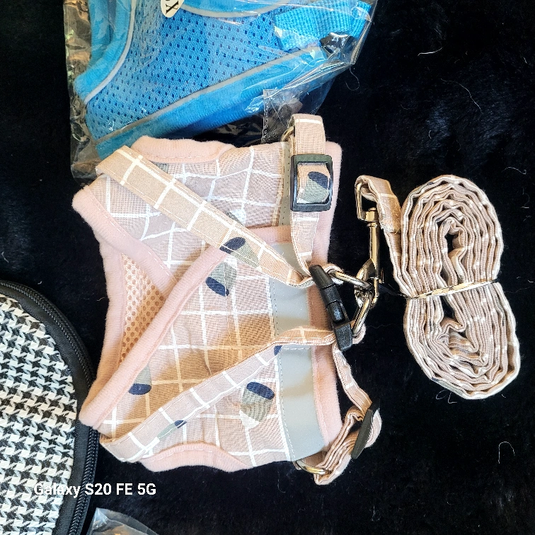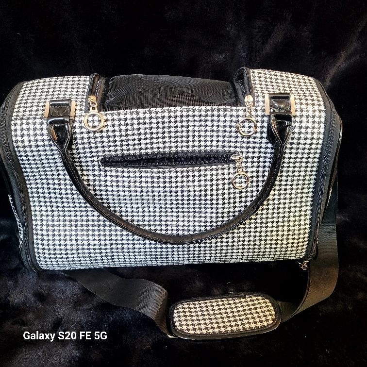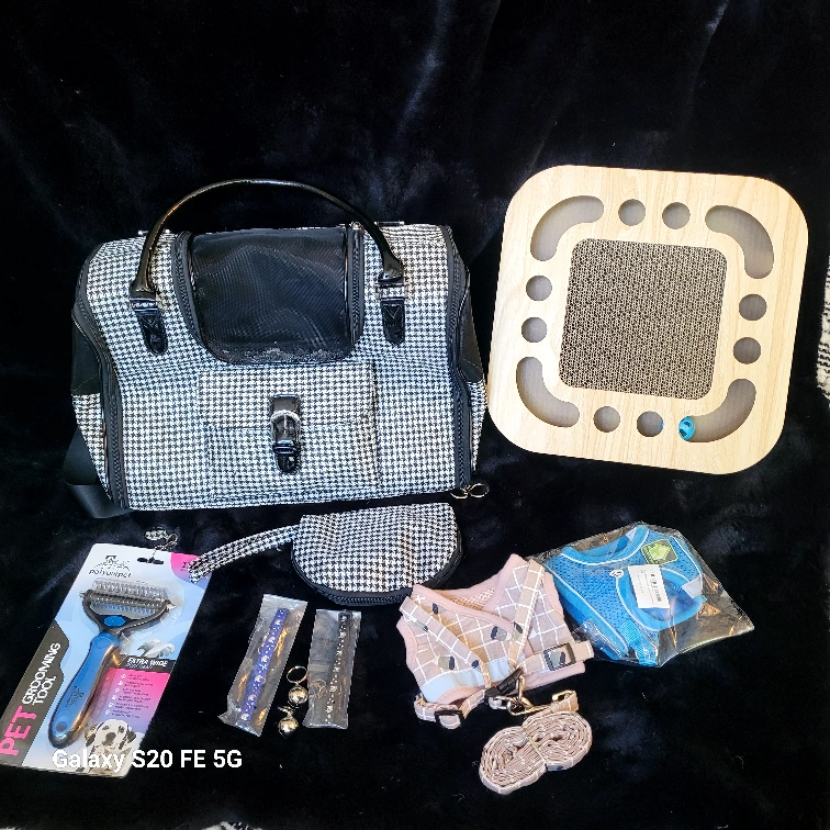 Selling a pet carrier with a houndstooth pattern, perfect for small dogs or cats. It comes with a shoulder strap for easy carrying! Also included is a Pat Your Pet grooming tool, designed to remove mats and undercoat. Plus, there's a cat scratcher toy for your feline friend to enjoy. 2 collars with bells so you always know where your furbaby is and 2 soft harnesses with co-ordinating leashes, blue is x-small and rose is small. All new except for the carrier. All zippers on carrier work. The netting on the top has had a repair, everything closes as it should (price reflects this)