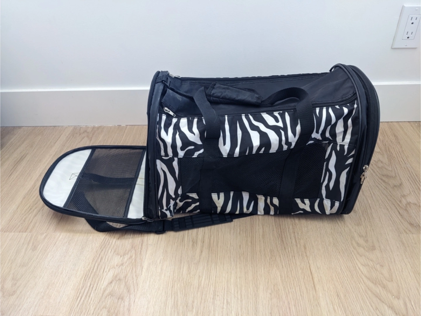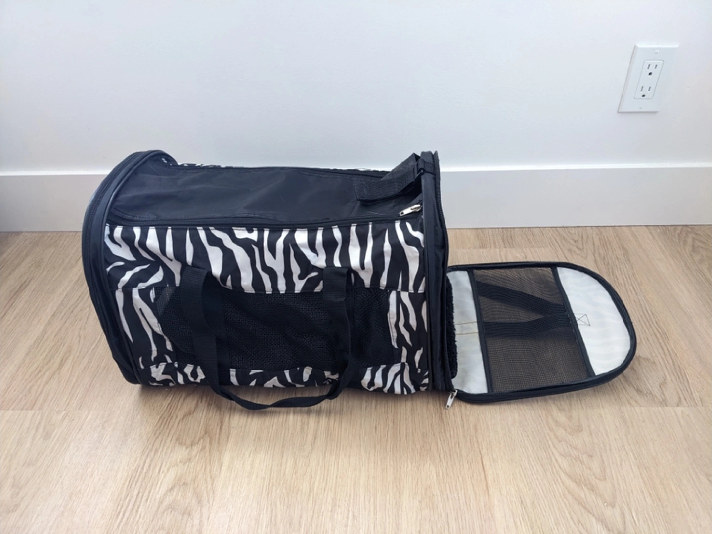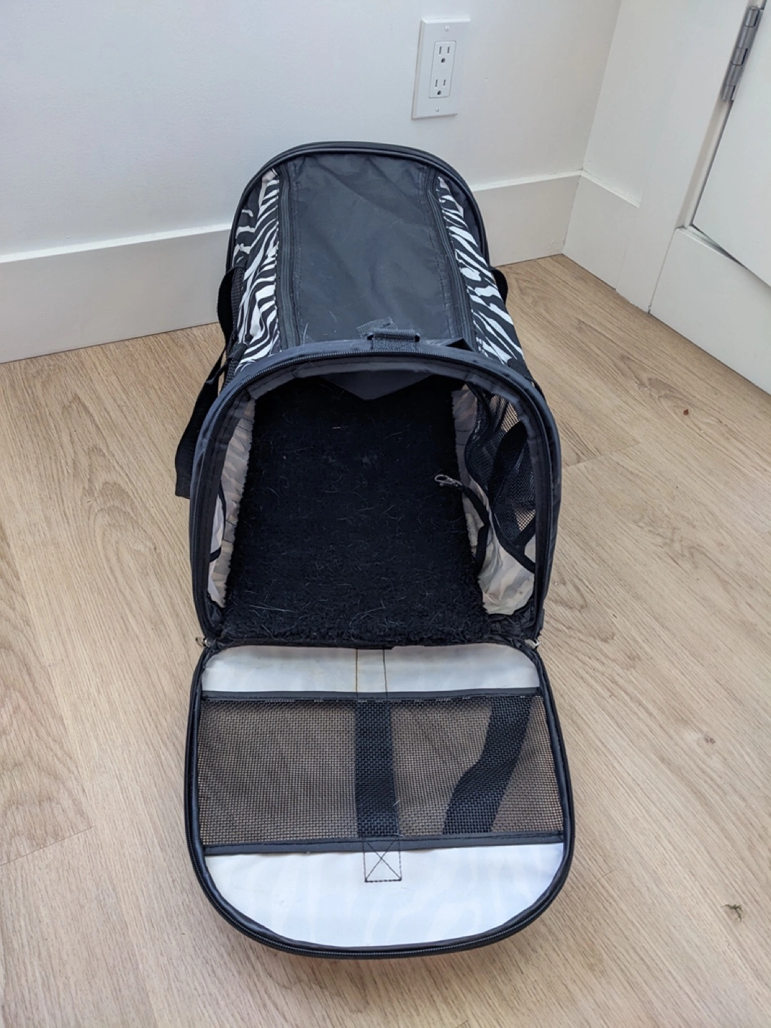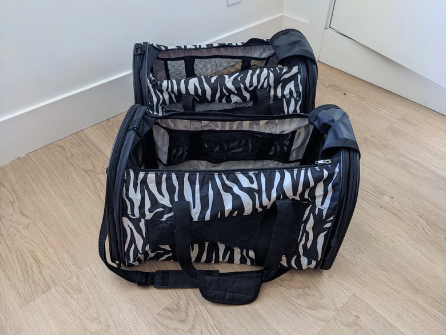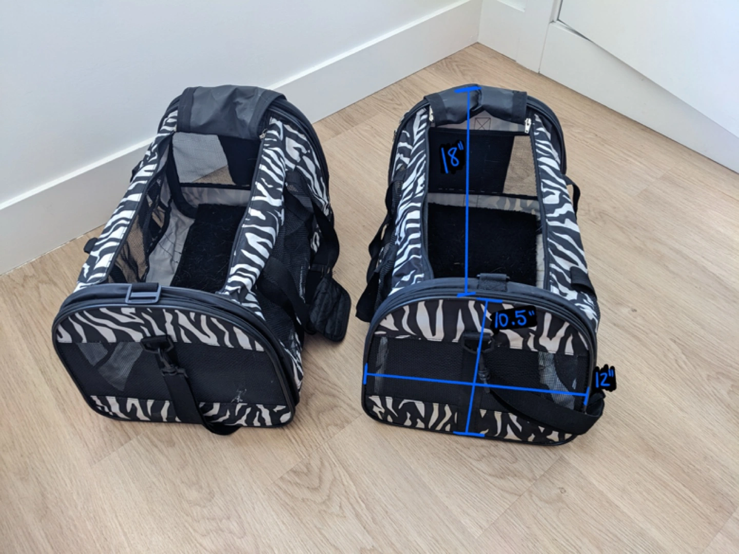 Good shape carriers for kittens or smaller sized adult cats.. or other small critters. I will clean them out if/when someone is interested. You can buy both for 25$ or 1 for 15$ Dimensions are w12 x h10.5 x d18” (also drawn in the photo) There are clips inside to clip to cat collars. The inside bottom can be removed for cleaning and it is semi-hard flexible. We primarily used the top opening, but both ends of the carrier also zips open. One size zips open fully and the other about half way.