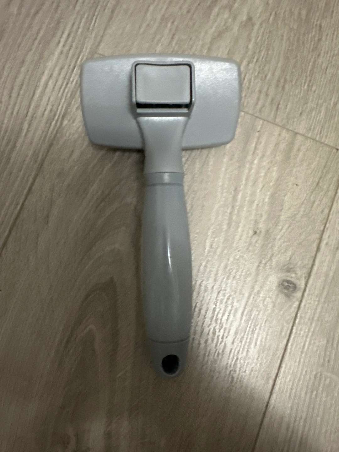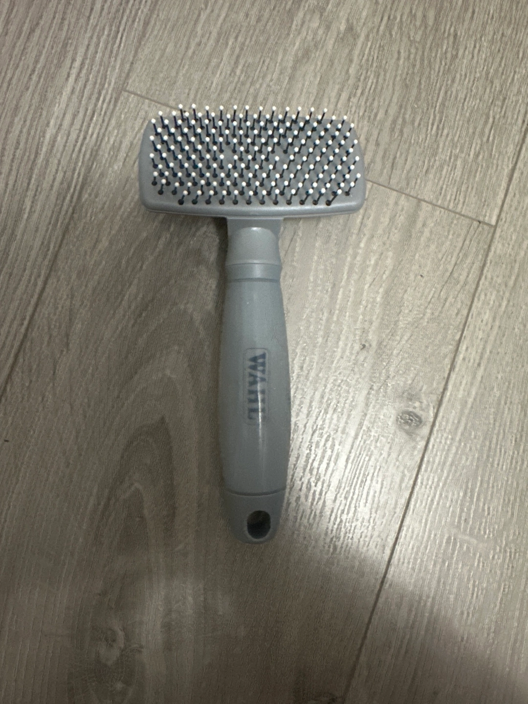 A grey pet grooming brush. It is from the brand "Wild One". The brush has a comfortable handle and is designed for easy grooming. The brush is in good condition. It has the button to push out the fur