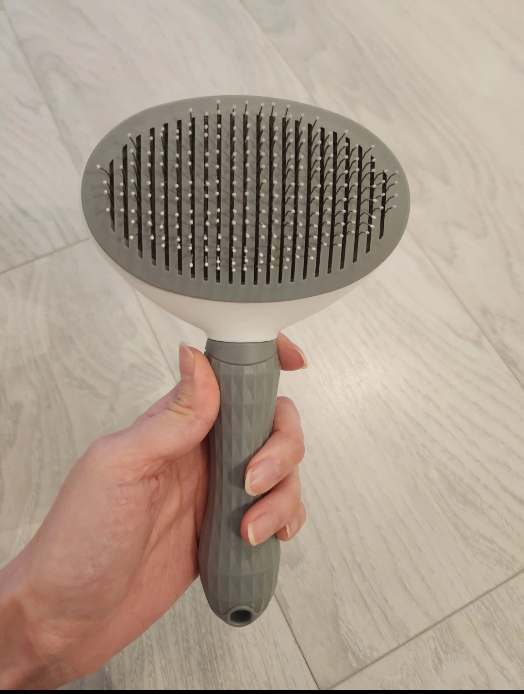 Looking to sell this pet grooming brush! It's a self-cleaning slicker brush, perfect for keeping your furry friend looking their best. The bristles retract for easy cleaning, making grooming a breeze