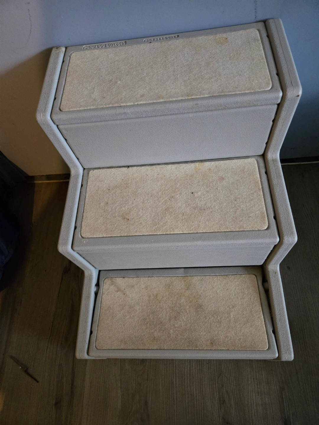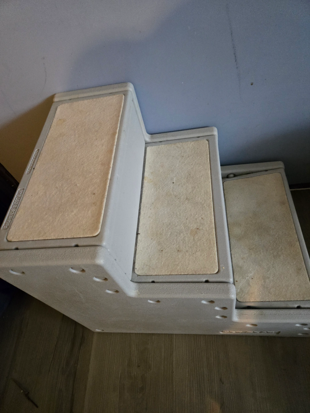 Three-step pet stairs. Grey plastic with beige carpet-like treads. Shows very little wear.