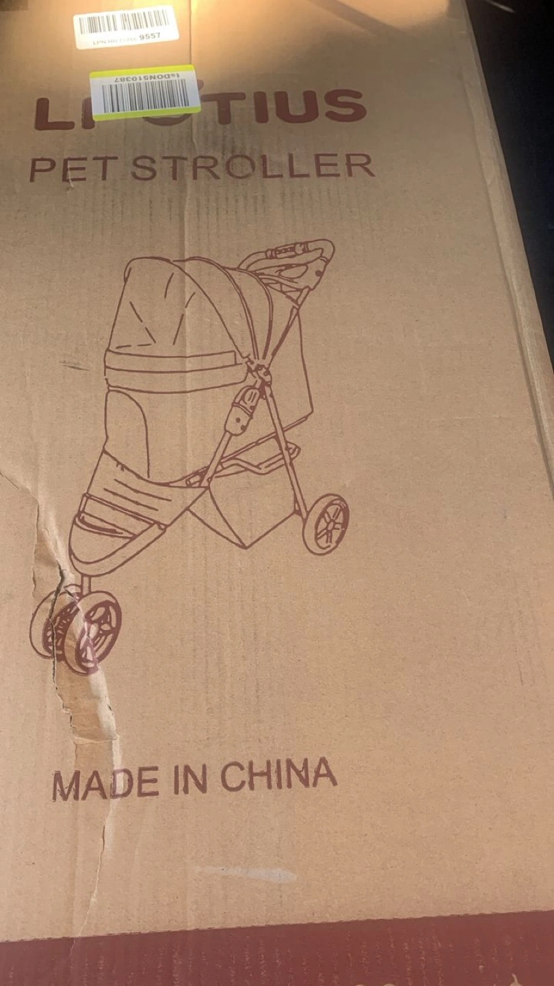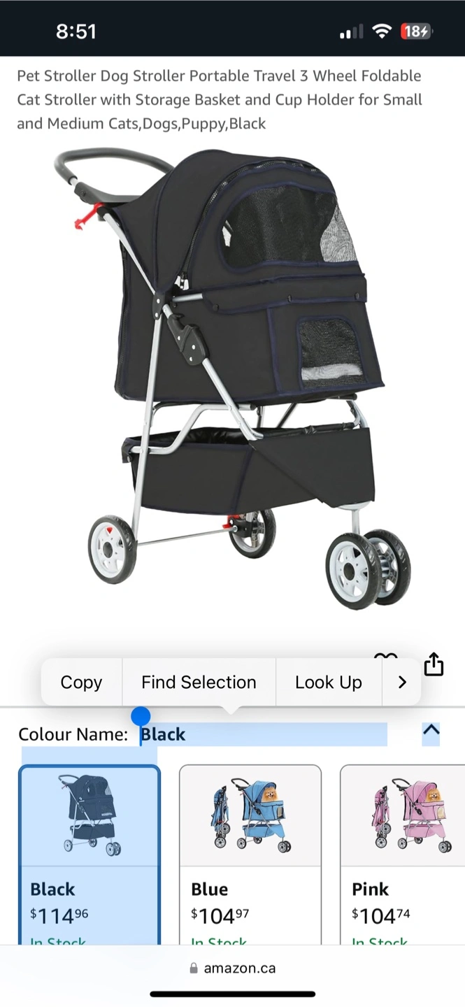 Portable pet stroller. Three wheels. Foldable design. Includes storage basket and cup holder. Suitable for small to medium cats and dogs. Black colour.