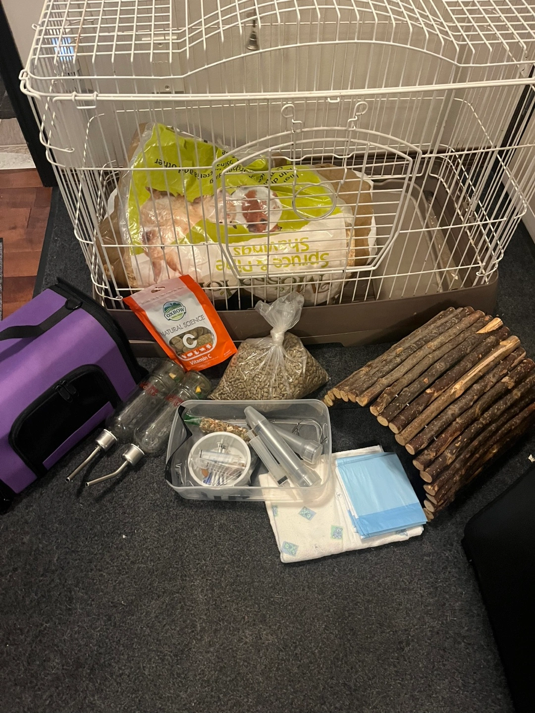 Selling a small animal cage, perfect for small pets! Small animal cage with 2nd floor with ramp(screws needed to hold floor), spruce and pine shavings, pet carrier (used once), 2 water bottles, bag of guinea pig food (if not needed then just throw out), vitamin c cookies, chew stick, 3 feeding syringes and 7 medicine syringes, wood den, 2 pee pads and clean animal towel, and pet food bowl.