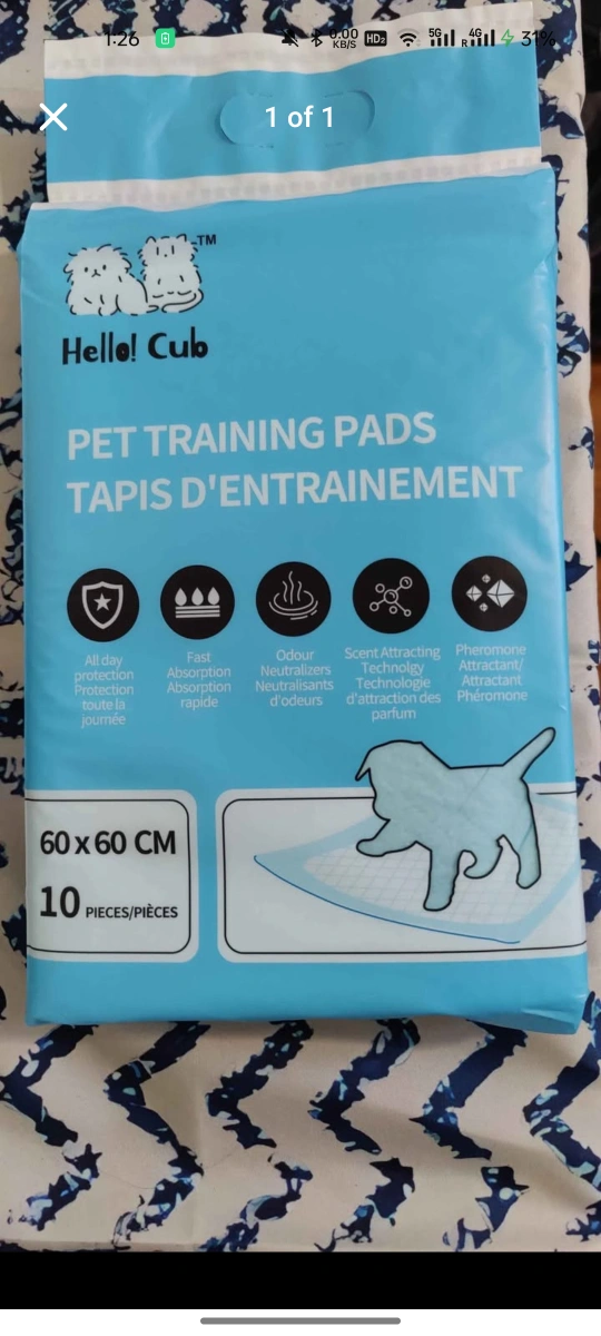 Training pads with fast absorption. The package contains 10 pieces and they are 60x60 cm. These pads can provide all day protection. They can be a great way to help your puppy, or older dog, with housetraining, offering them a safe place to relieve themselves.