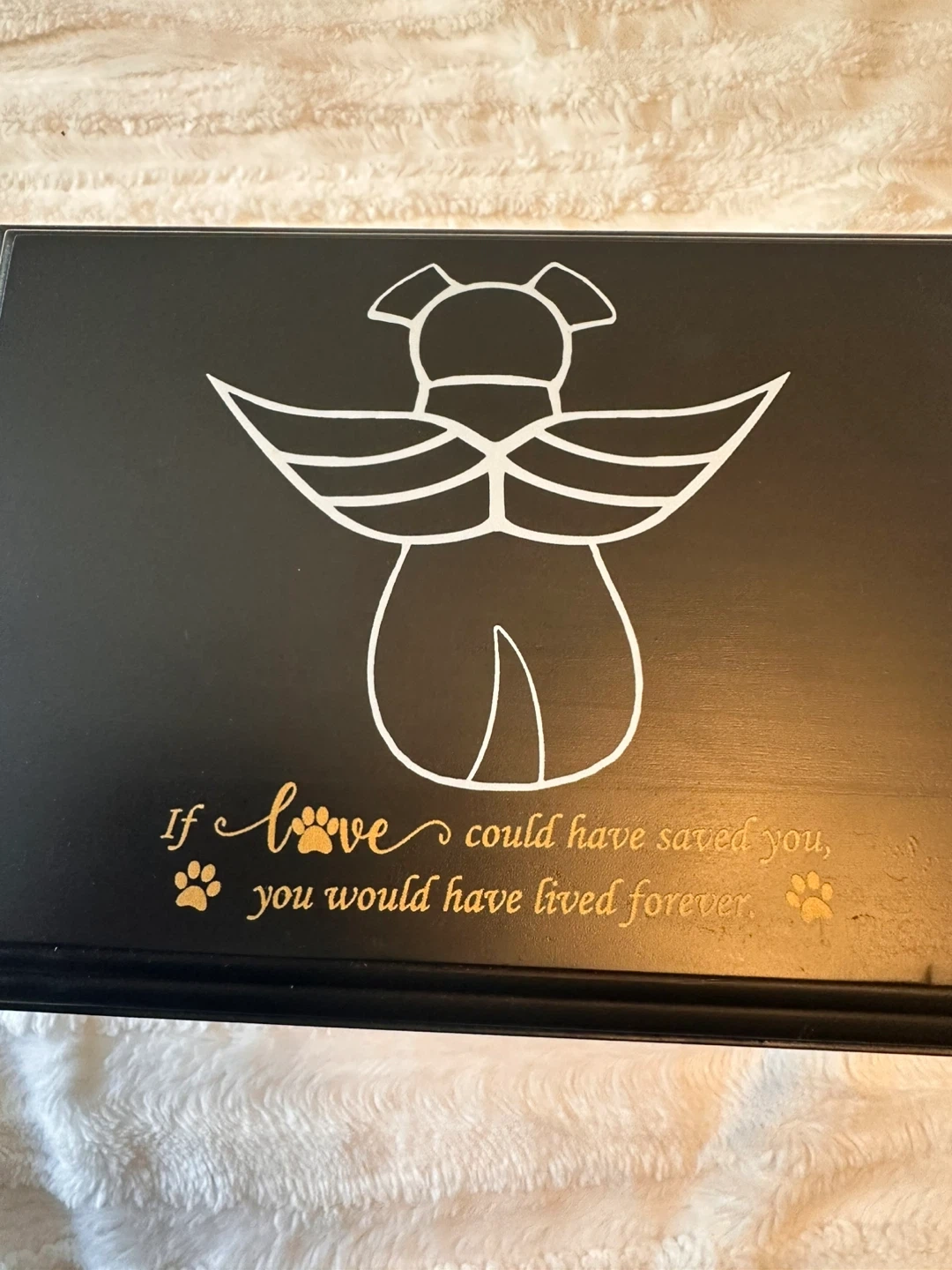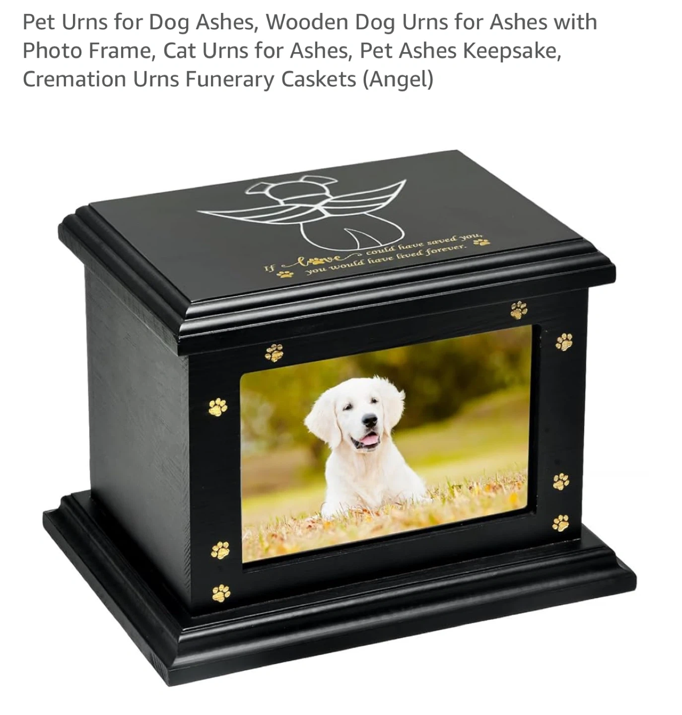 Pet urn for your beloved furry friend. This wooden dog urn features a photo frame to display your pet's picture. It's designed as a pet ashes keepsake and cremation urn. The dimensions are approximately 6.70in x 6.70in x 6.90in