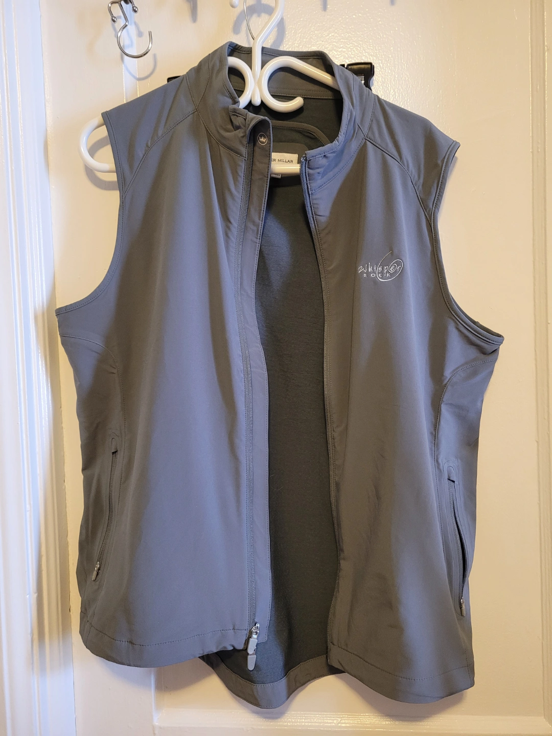 Grey sleeveless vest. Size medium. Full zip closure. Two front pockets. Made in Thailand.