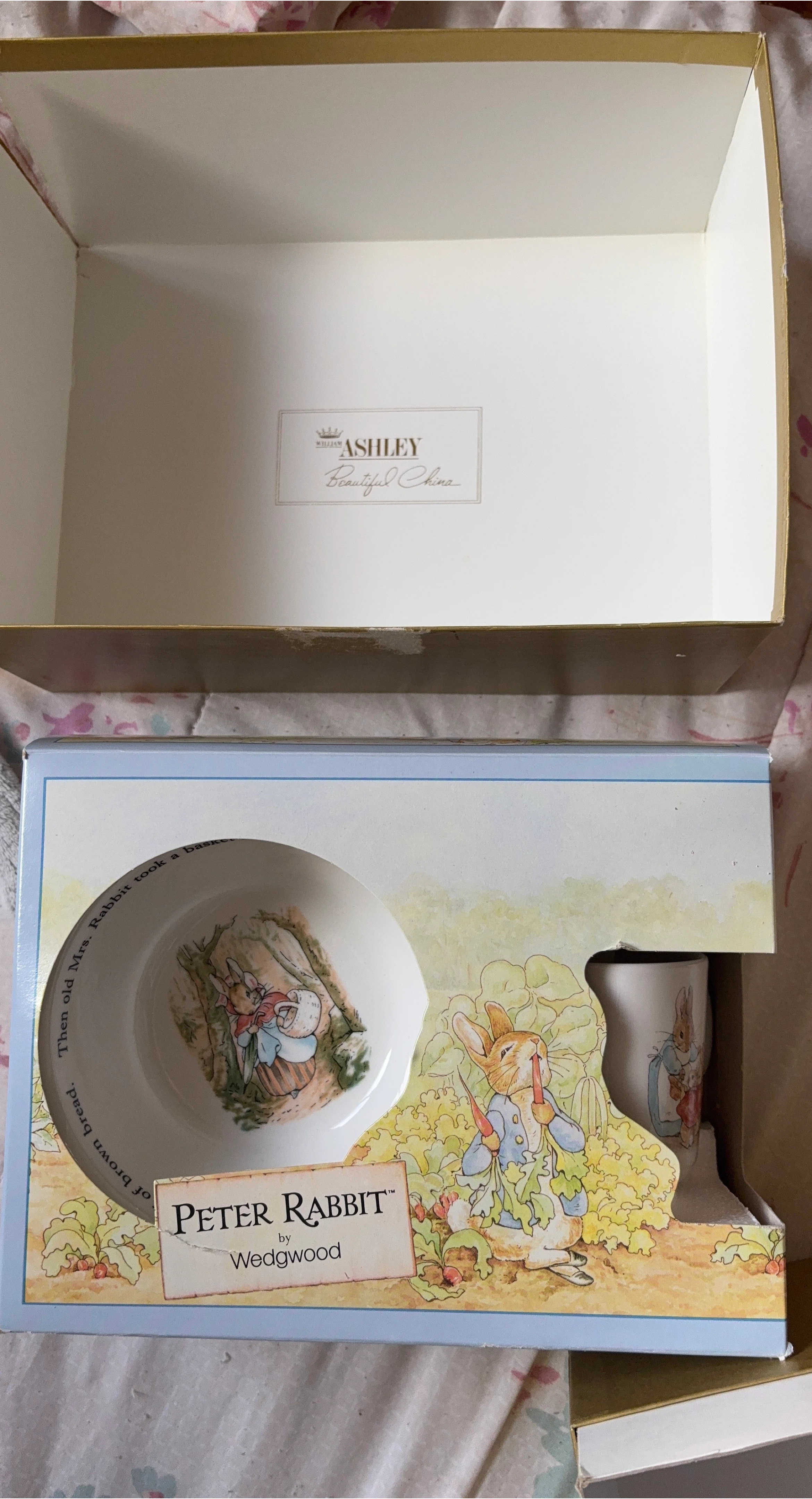 Super cute Peter Rabbit bowl and mug set by Wedgwood! It features adorable illustrations from the classic stories. The set comes with its original box, perfect for a gift or collector's item. A charming addition to any kitchen or nursery!