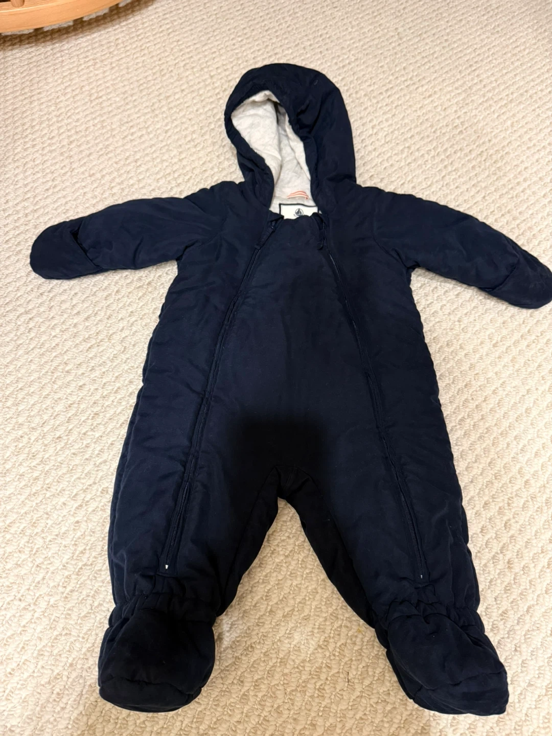 Keep your little one warm with this adorable Petit Bateau snowsuit! It's in great condition and perfect for those chilly Canadian days. The size is 12 months, and it's a lovely navy blue colour