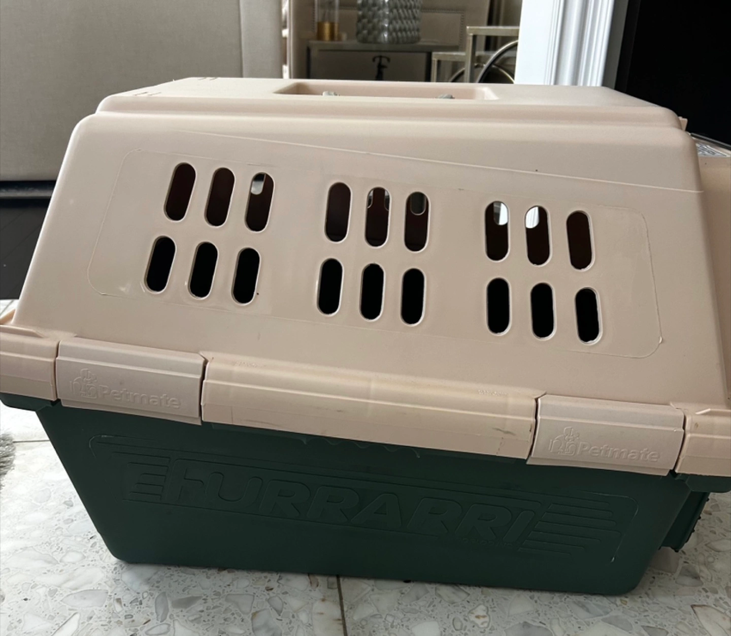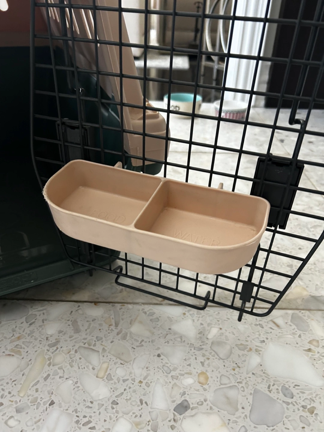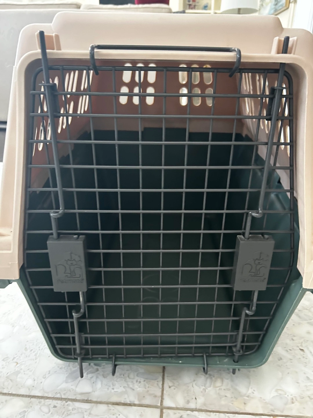 Durable plastic pet carrier. Beige and green. Includes a two-compartment food/water dish. Great for travel.