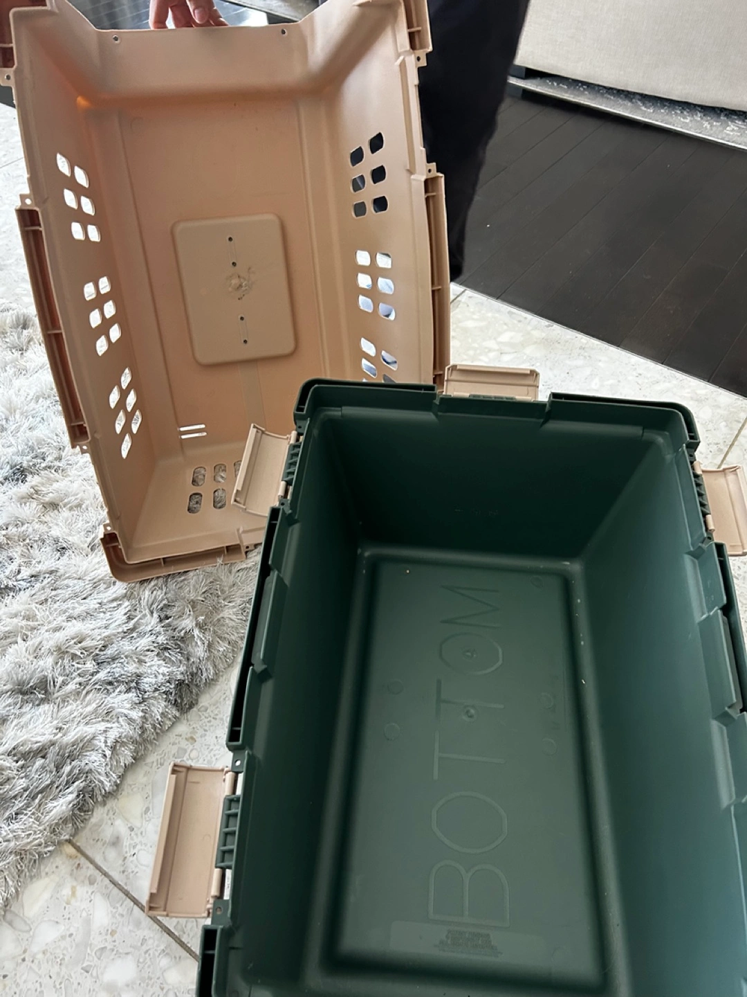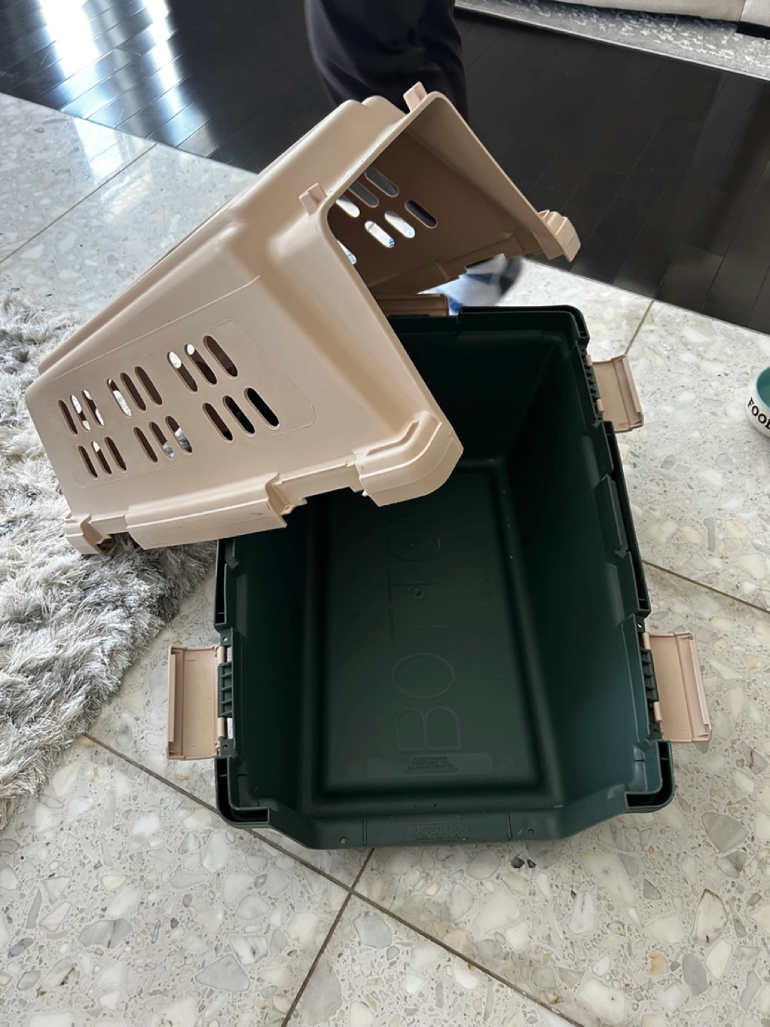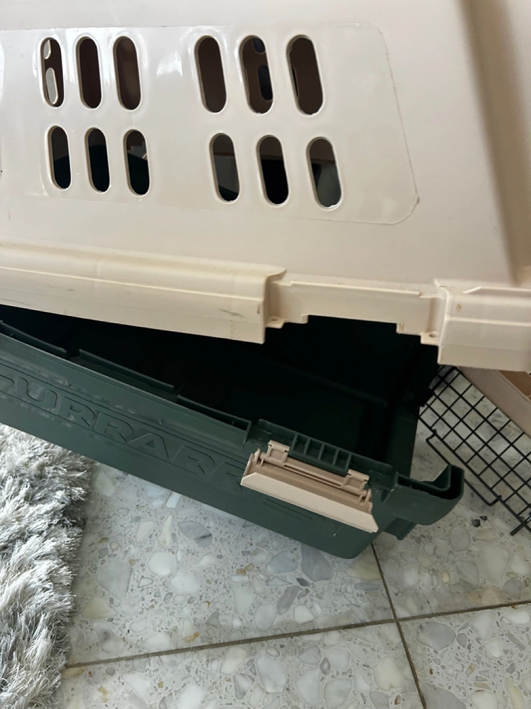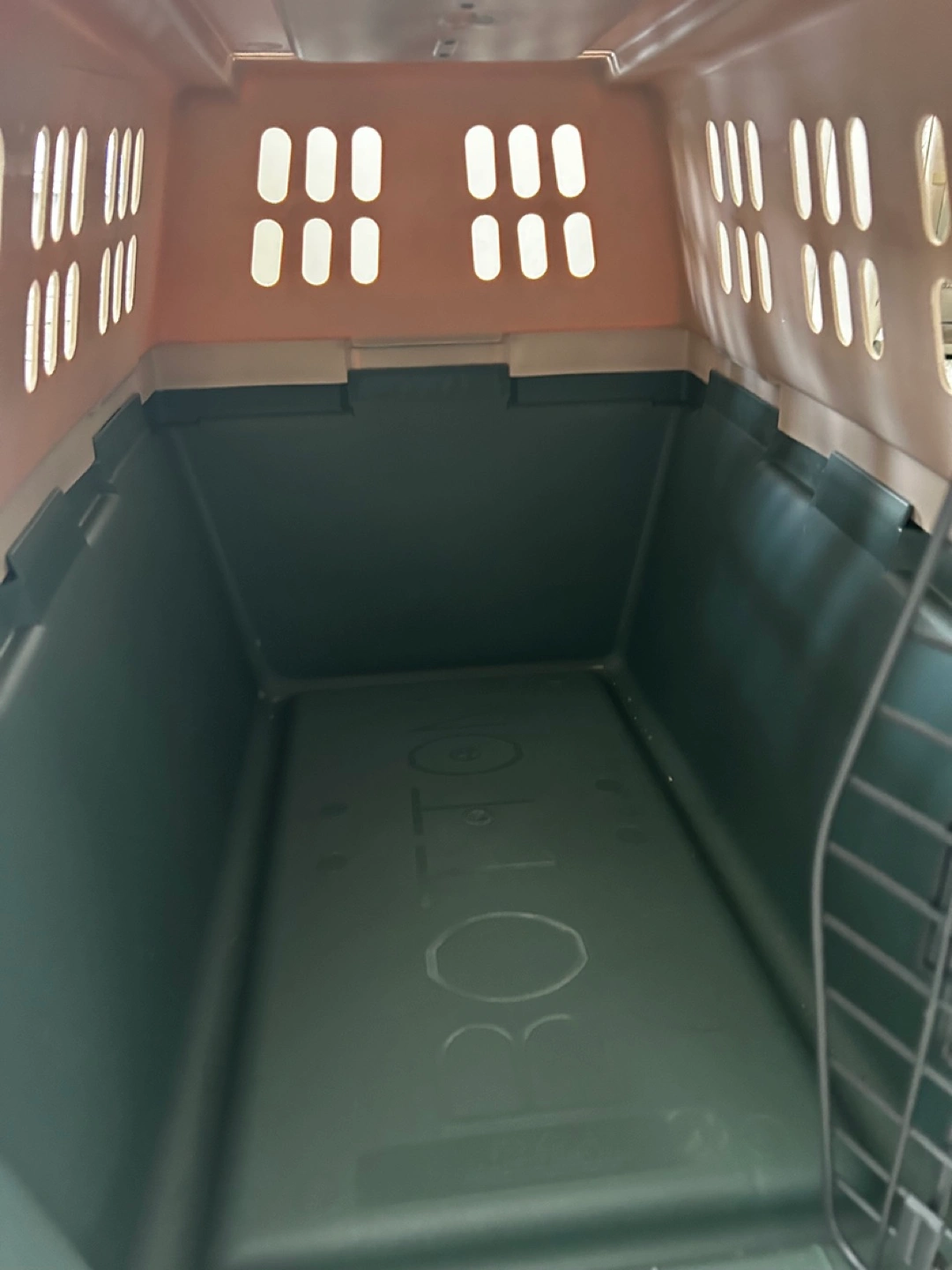 Durable plastic pet carrier. Beige and green. Includes a two-compartment food/water dish. Great for travel.