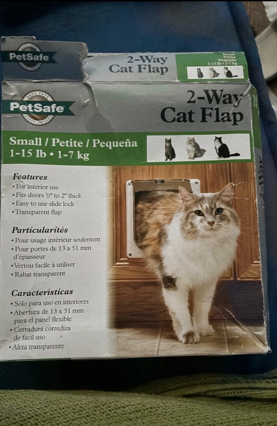 Selling a PetSafe 2-Way Cat Flap, size small. It's designed for interior use and fits doors 1/2" to 2" thick. Features an easy-to-use slide lock and a transparent flap. Perfect for your feline friend!