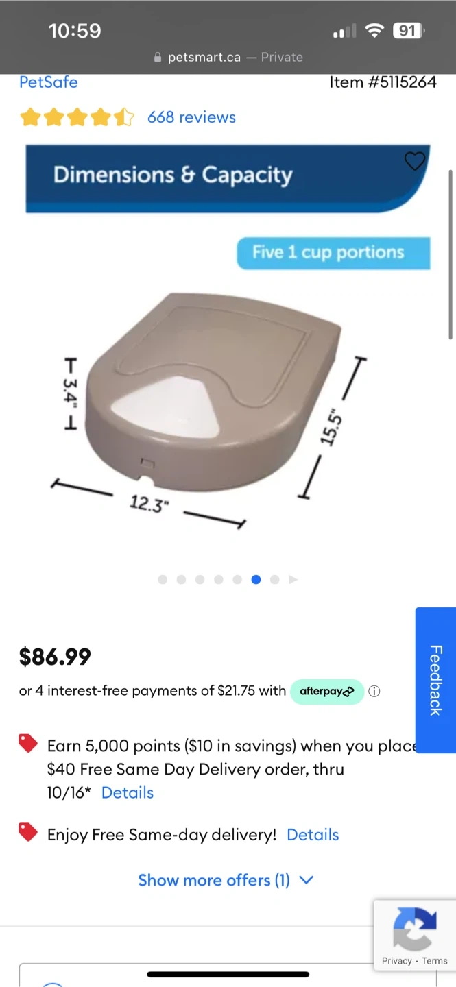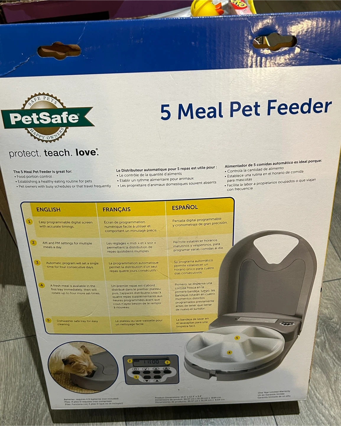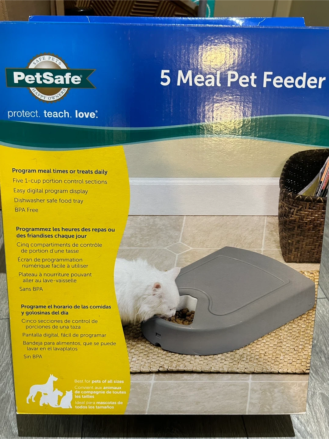 Brand new in box Pick up burnaby Programmable automatic pet feeder with electronic timer It has 5 portion control sections and an easy digital program display. The food tray is dishwasher safe and BPA free. 4 D-cell batteries not included.