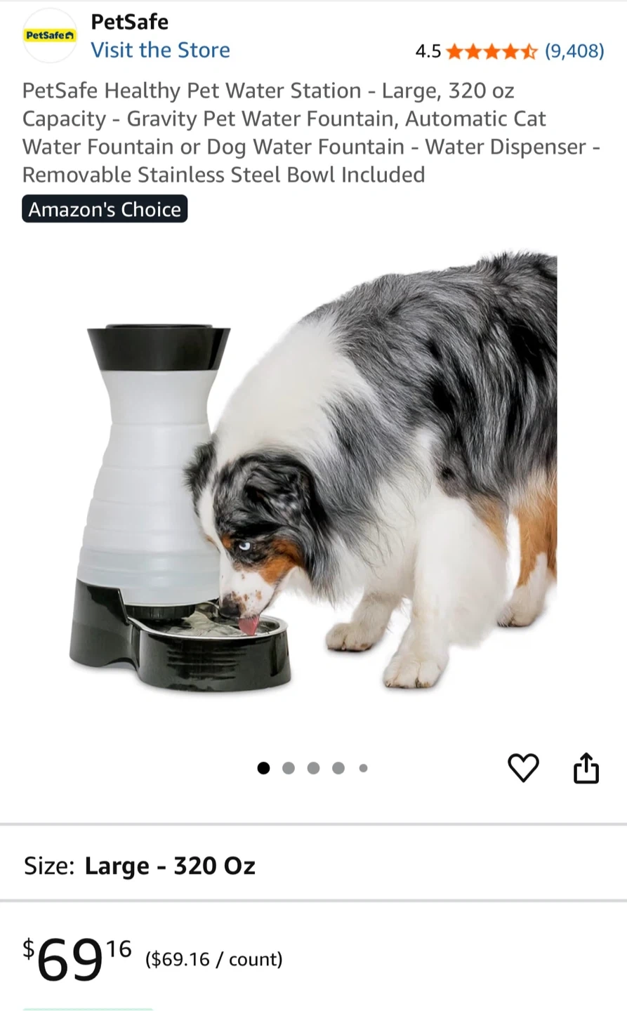 Selling a PetSafe Healthy Pet Water Station in large size. It holds 320 oz of water. It's an automatic cat or dog water fountain with a removable stainless steel bowl. Retails on Amazon for $69.16.