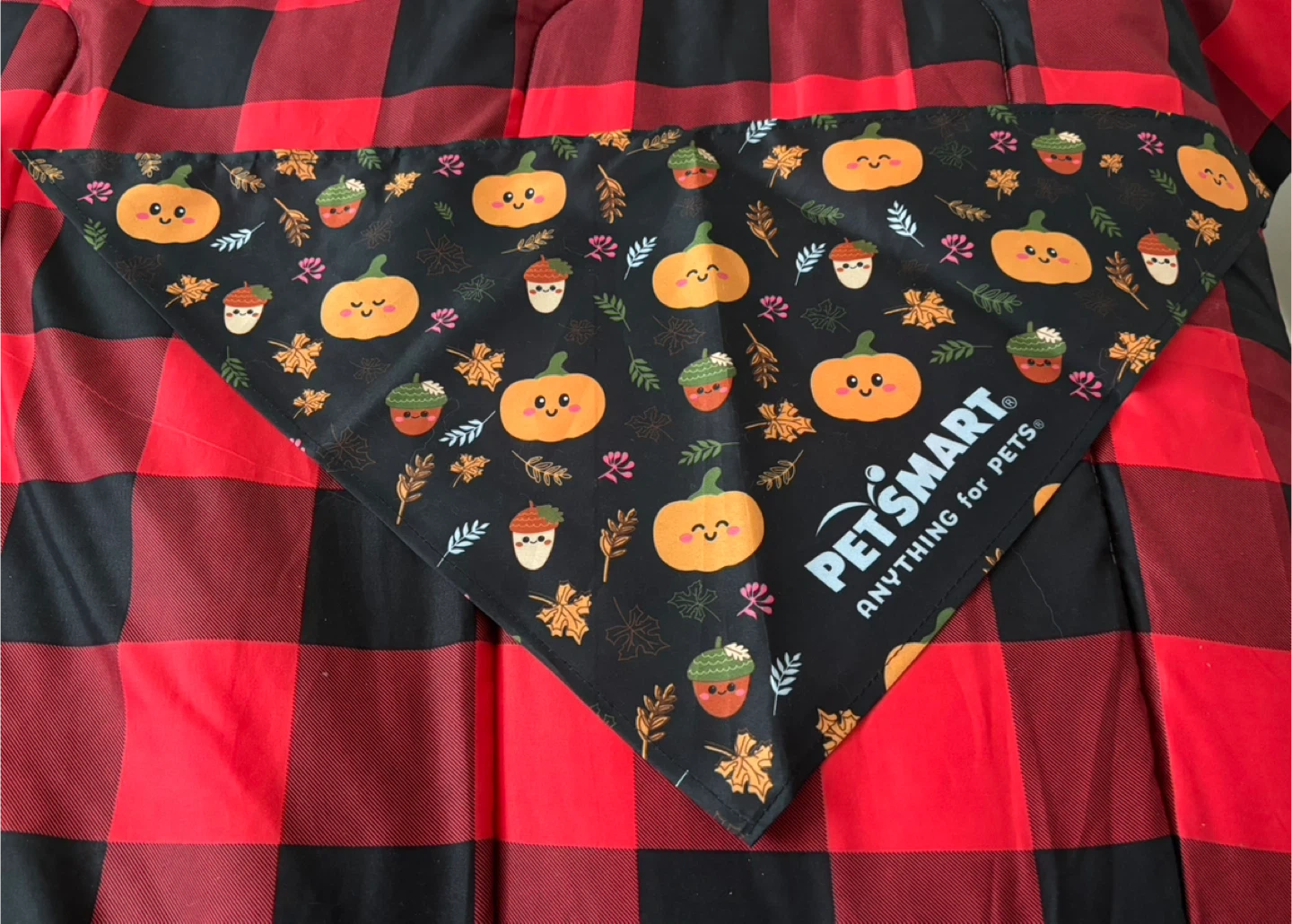 This is a cute PetSmart dog bandana with a fall theme! It has pumpkins, acorns, and leaves on a black background. Perfect for your furry friend to celebrate the season