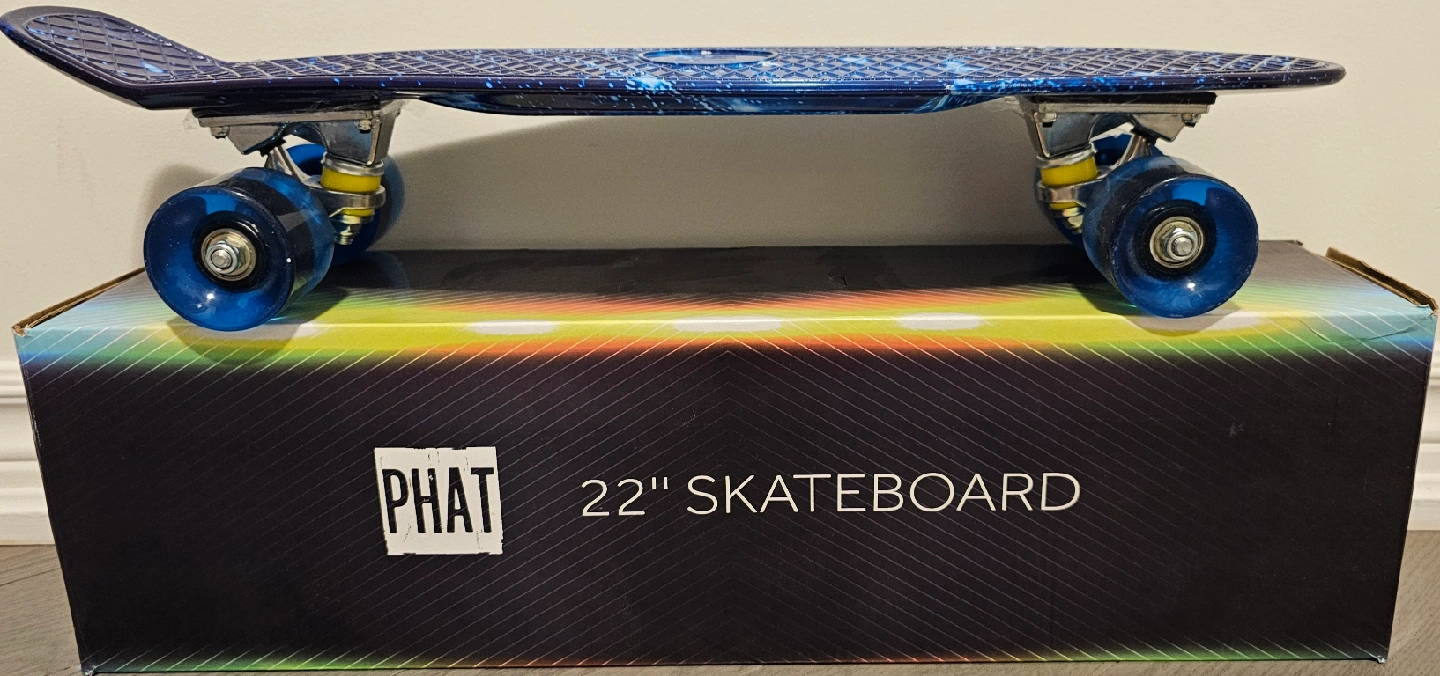 Selling a PHAT 22" skateboard in blue! It's in great shape and ready for some fun. Comes with the original box too