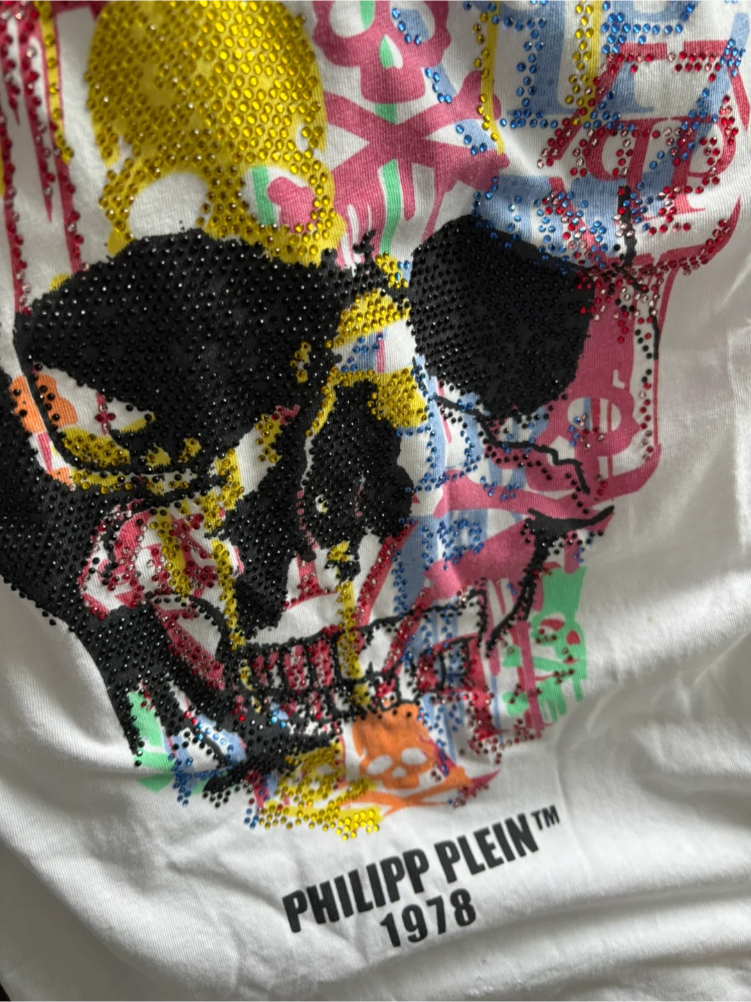 This is a Philipp Plein white t-shirt with a colourful graphic skull design on the front. The shirt also features the brand name and '1978'. It's in great condition and ready for a new home! (Can fit a medium woman’s/small men’s.)