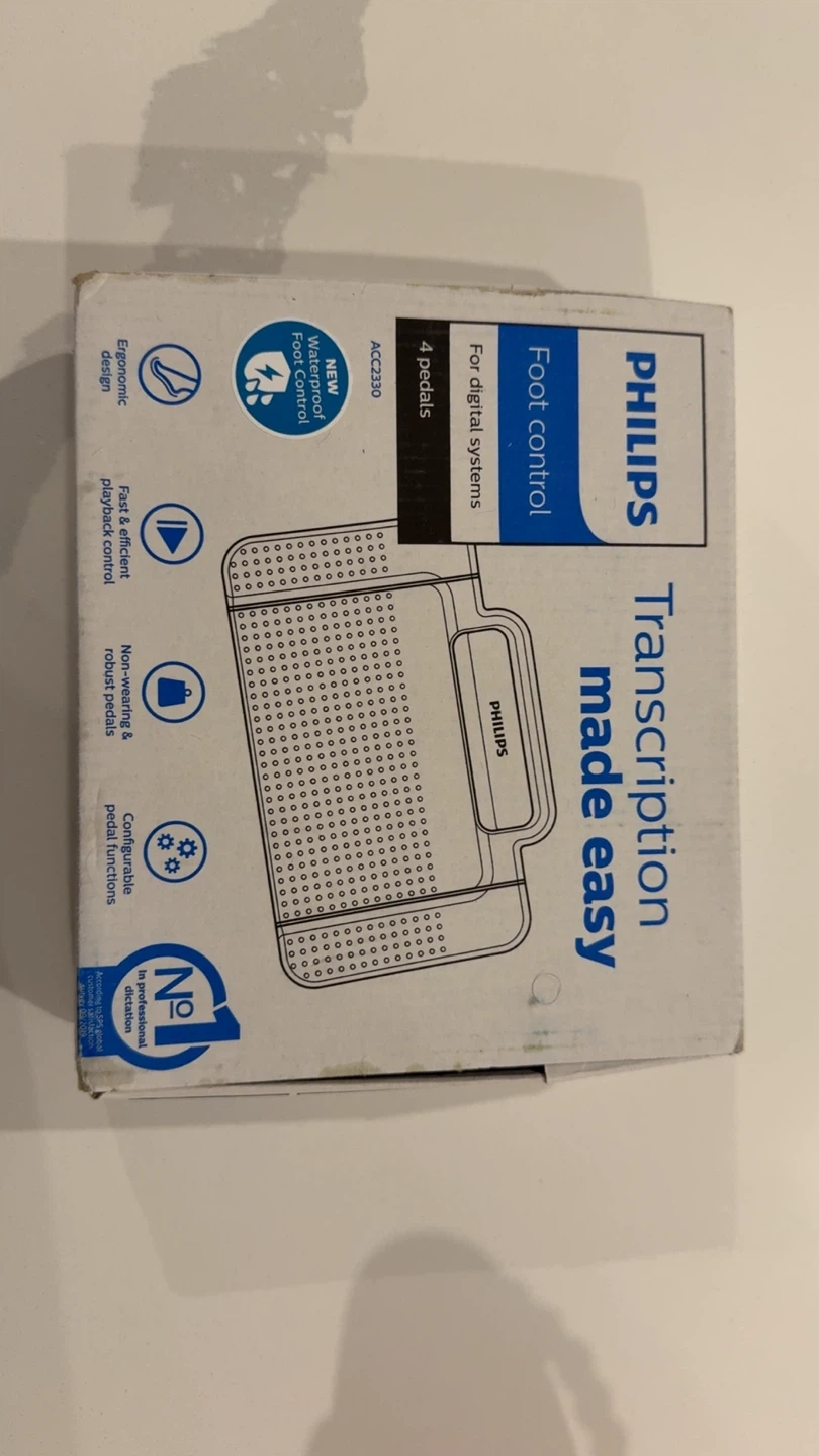 Selling a brand new Philips ACC2330 Foot Control Pedal for digital systems! It's still in its original box and features an ergonomic design. This foot control offers fast and efficient playback control, non-wearing and robust pedals, and configurable pedal functions. It is also waterproof!