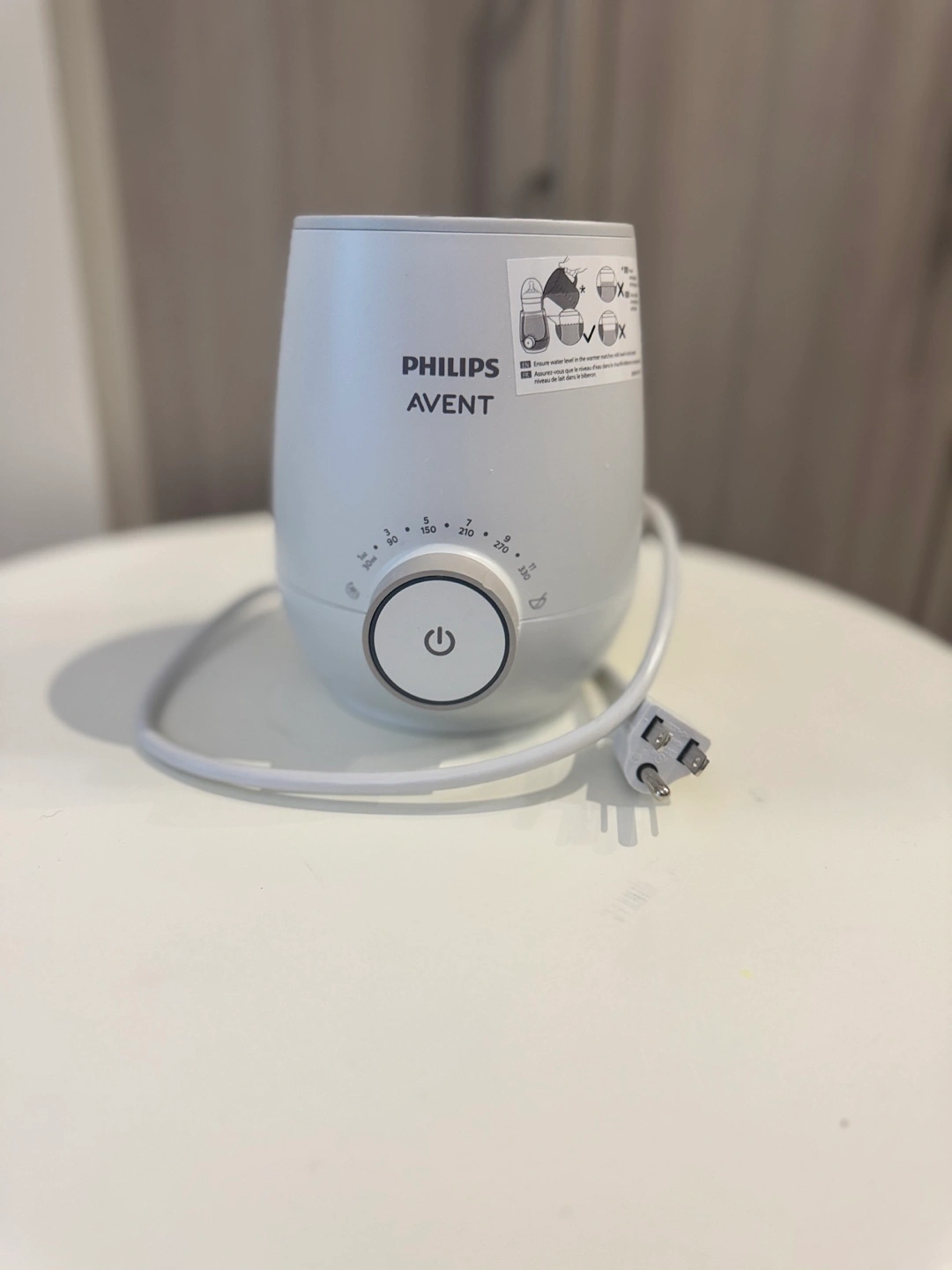 A white appliance. Features a round base. Power cord attached. Comes with a button on the front. The product is used to warm up baby bottles, a great way to soothe your little one when they need it most.