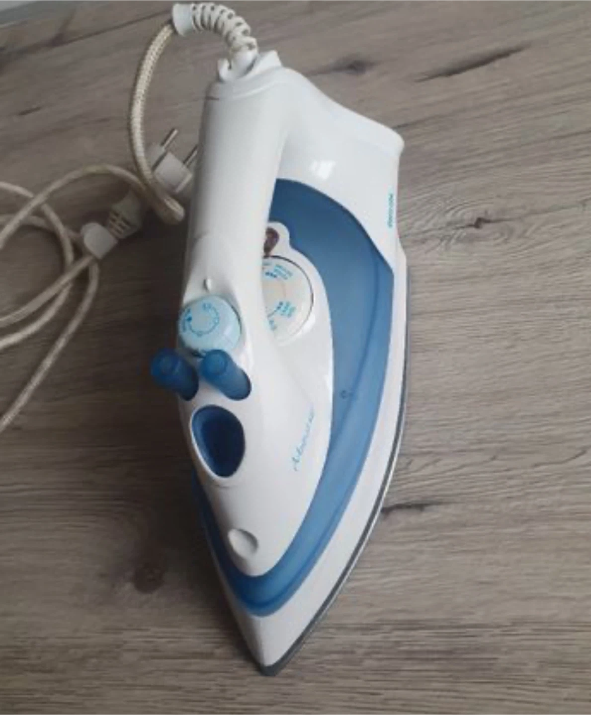 Selling a Philips Azurite steam iron in white and blue. It's in great condition and ready to help you get those wrinkles out!