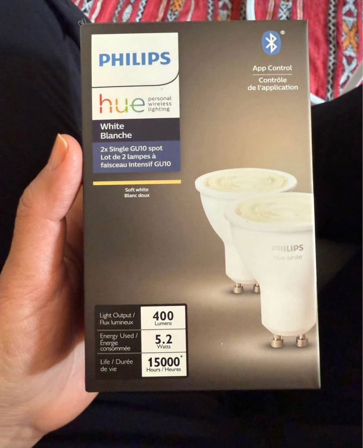 4 Philips GU10 smart spotlight (including one new in box): 1 bulb (old): $20 1 bulb (new): $30 All 4 bulbs for $80 ($10 discount) Used for a year, excellent working condition.