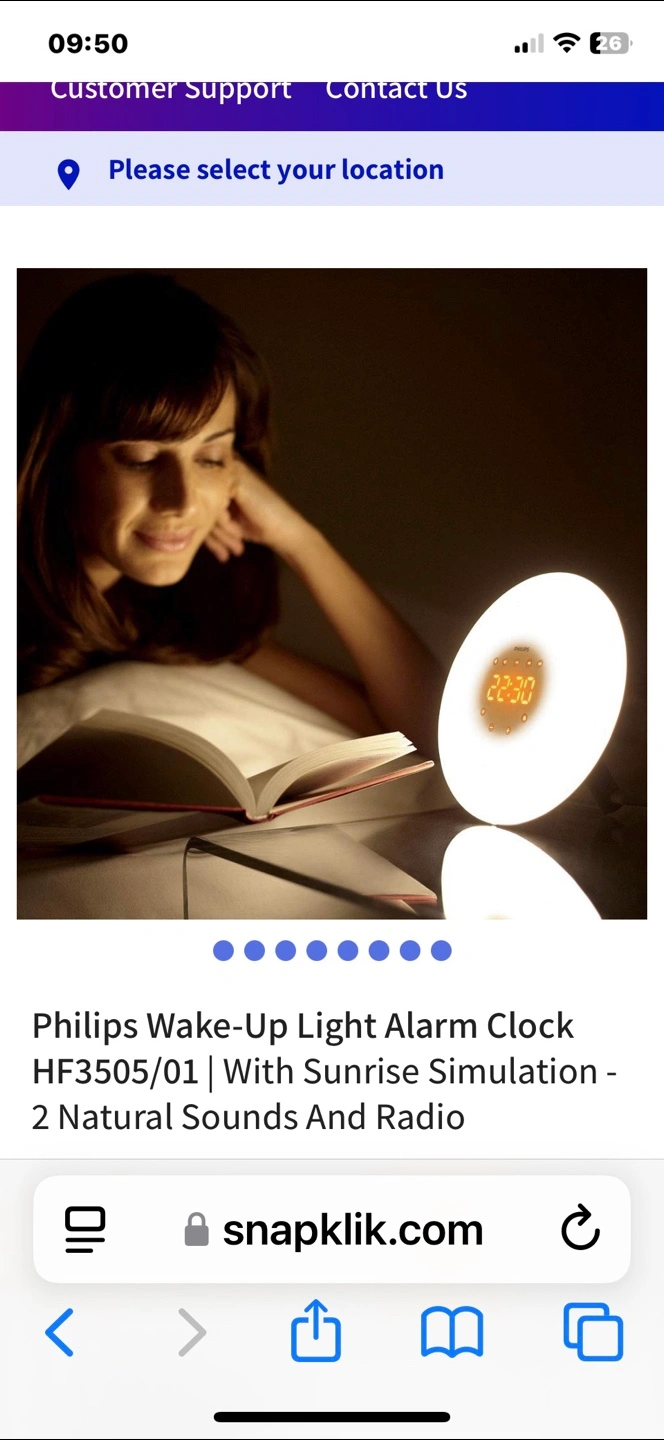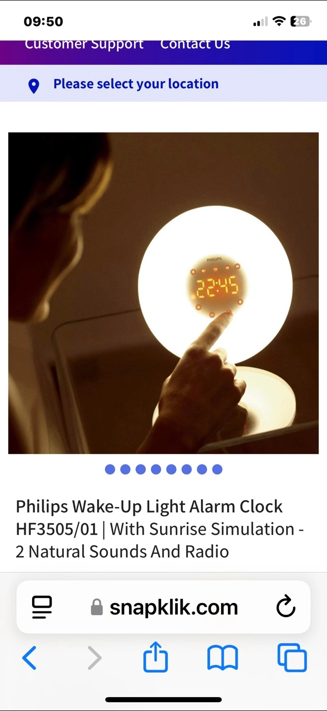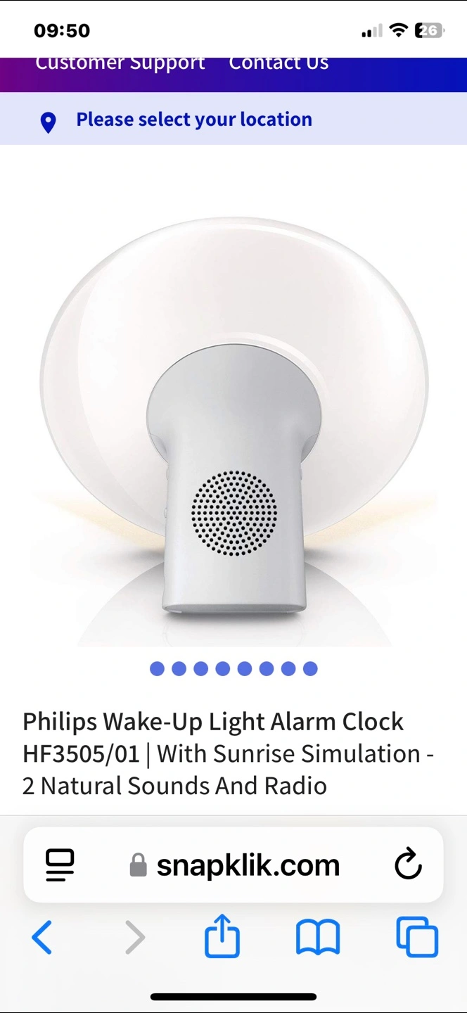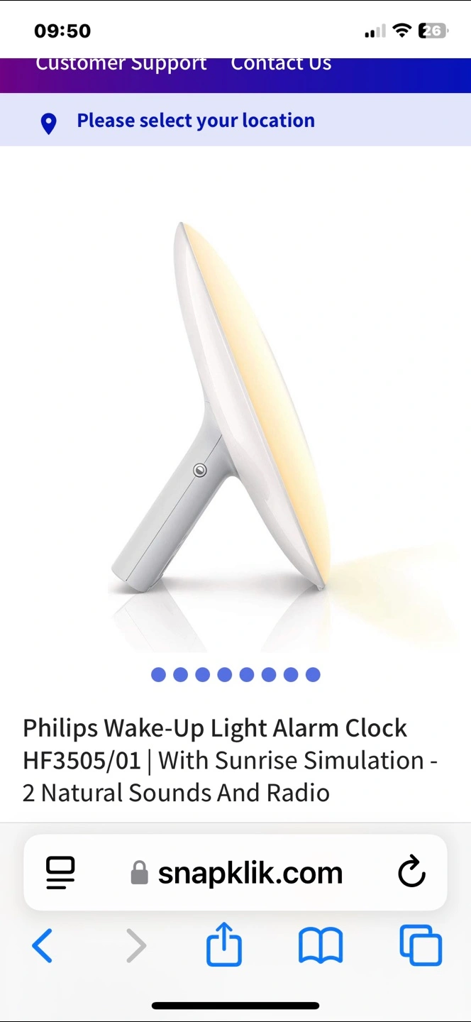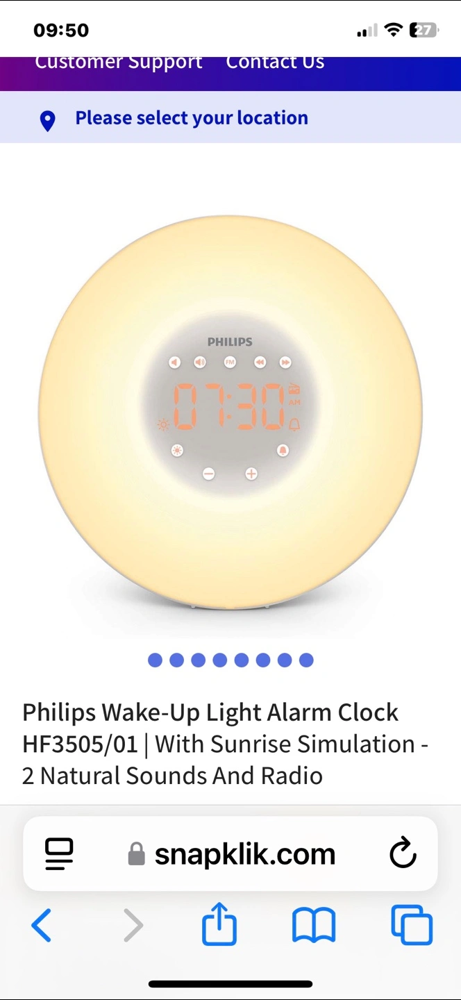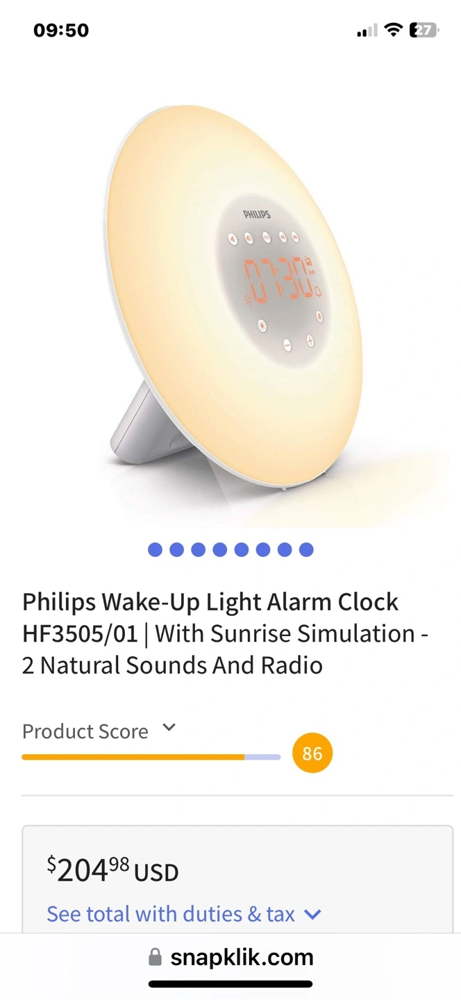 Philips wake-up light alarm clock. Features sunrise simulation, two natural sounds, and a radio. Great for a peaceful wake-up. I do not have the box any more.