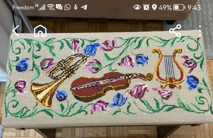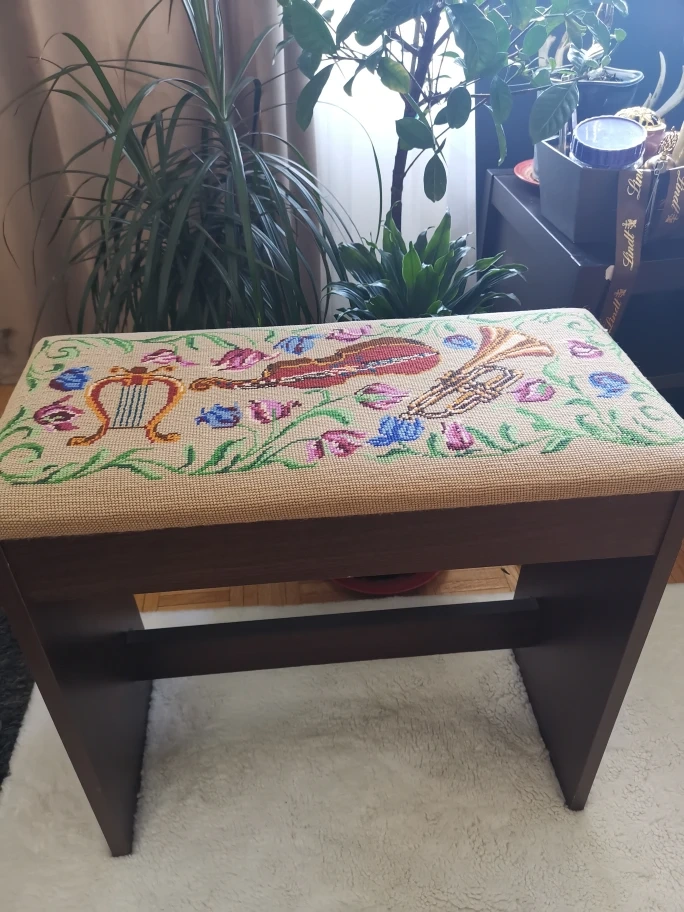 Beautiful piano bench. Features a hand-stitched tapestry seat depicting various musical instruments. Dark brown wooden frame. Sturdy construction. Great addition to any music room.