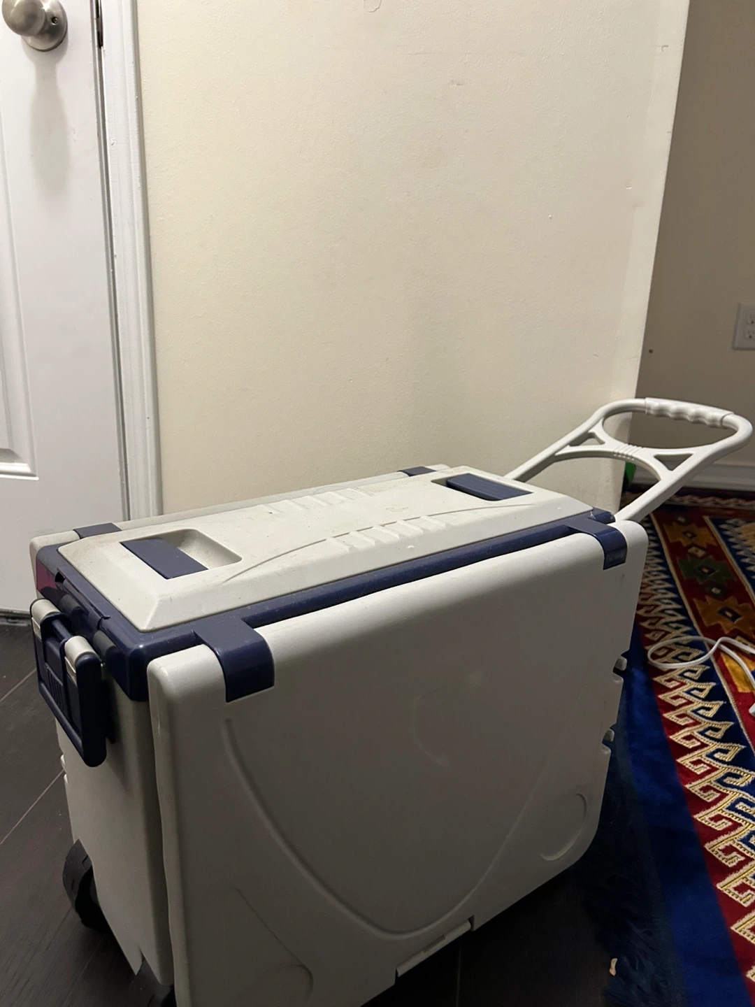 This portable picnic table comes with a built-in cooler and stools. It's perfect for outdoor gatherings, camping, or picnics in the park. The table folds up neatly into a compact case with wheels for easy transport. It's in great condition and ready for your next adventure