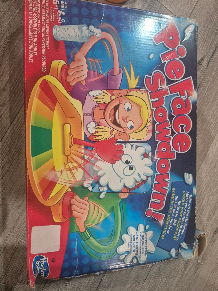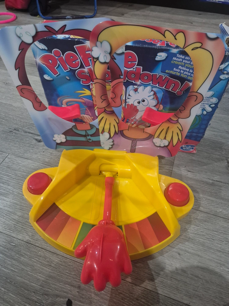 Selling a used Pie Face Showdown game by Hasbro. It's a fun game for the whole family! Take on the challenge and mash your button faster than your opponent to avoid getting creamed! The box is included