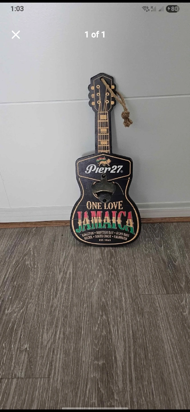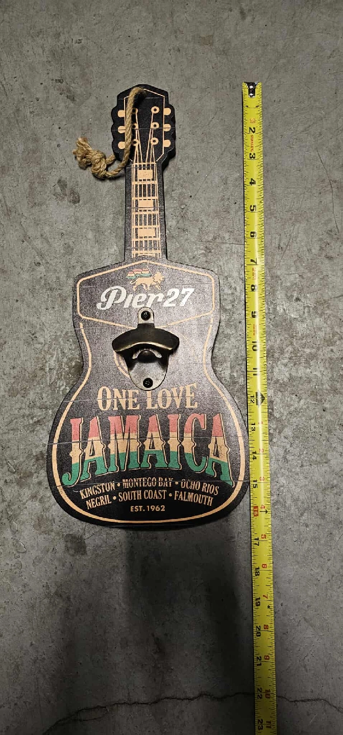 Selling a unique Pier 27 guitar-shaped bottle opener with a cool "One Love Jamaica" design! It's in great shape and ready to add some island vibes to your space. The bottle opener measures approximately 9 inches wide.