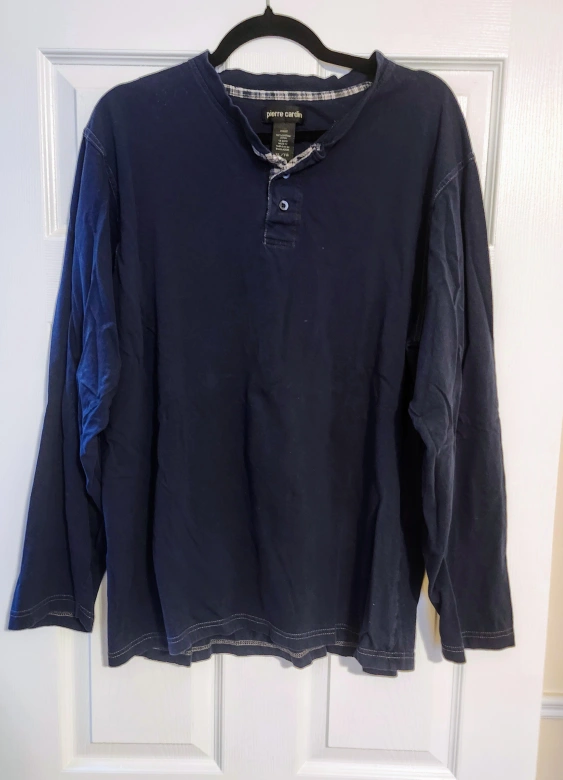 Navy blue long sleeve henley. Features a three button placket and plaid trim on the collar. Long sleeves and relaxed fit.