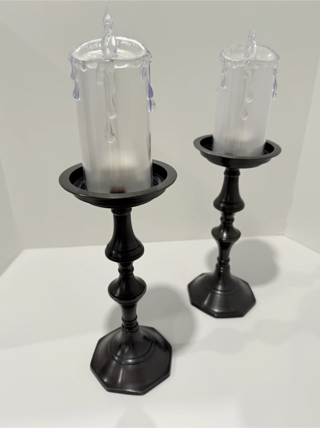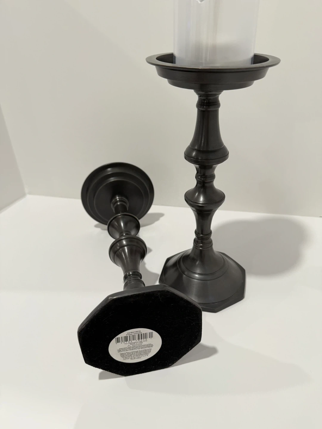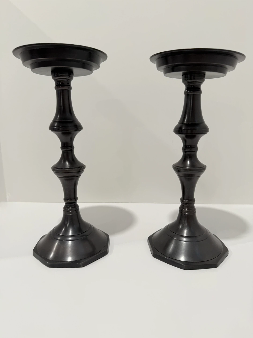 Selling a set of two pillar candle holders! They have a beautiful dark bronze finish and a classic design. Perfect for adding a touch of elegance to any room. QUALITY MATERIAL: Made of iron metal, handmade with sophisticated craftsmanship and gourd shape, presenting a unique and chic look. It also includes a velvet base to protect your furniture and are heavy cast-iron keeping your candles more stable.