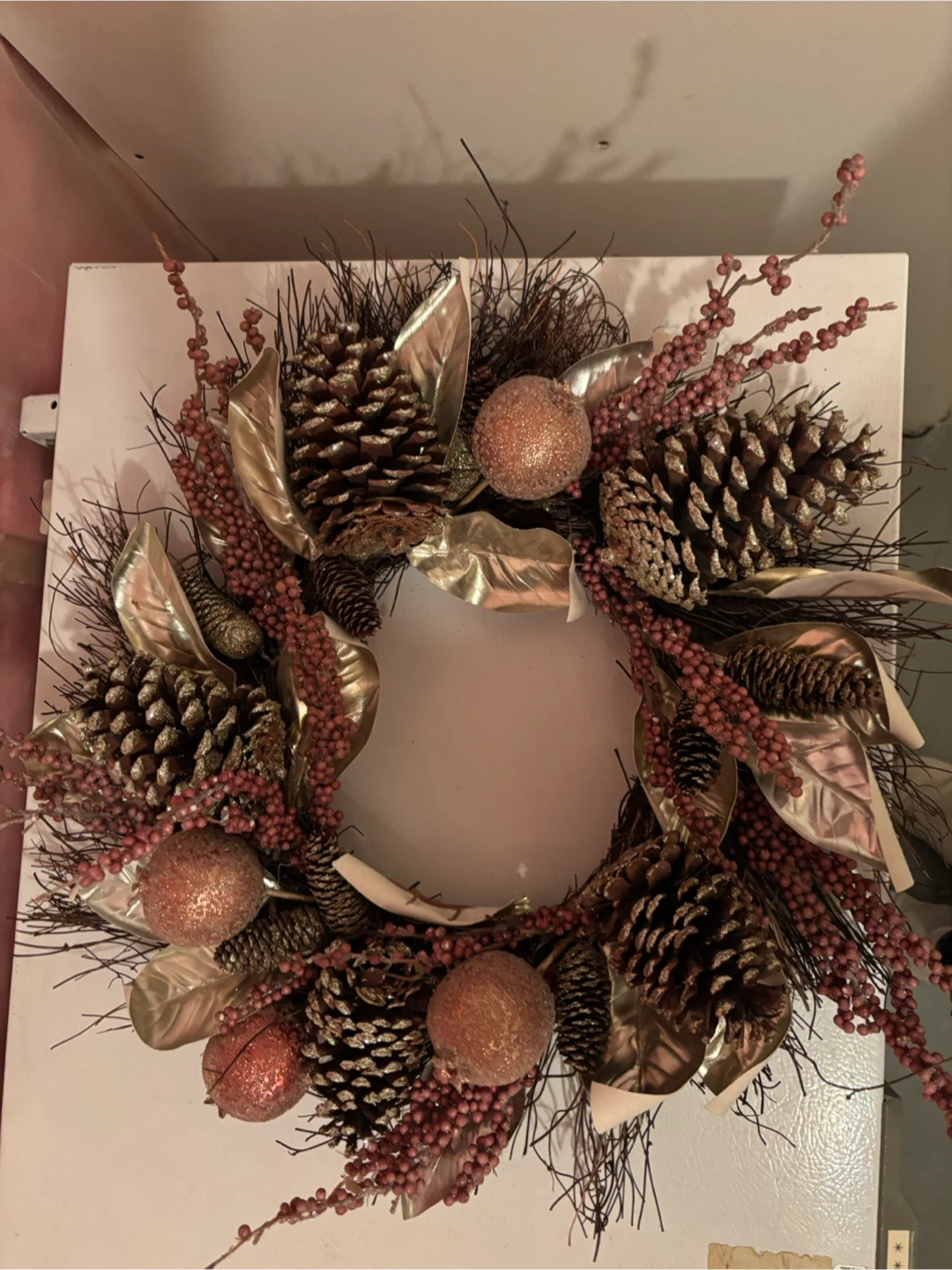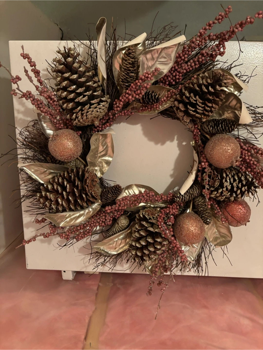 Selling a decorative wreath featuring pinecones, metallic leaves, and shimmering ornaments. It's perfect for adding a touch of rustic charm to your home decor, especially during the holidays! The wreath is in great condition and ready to be displayed.