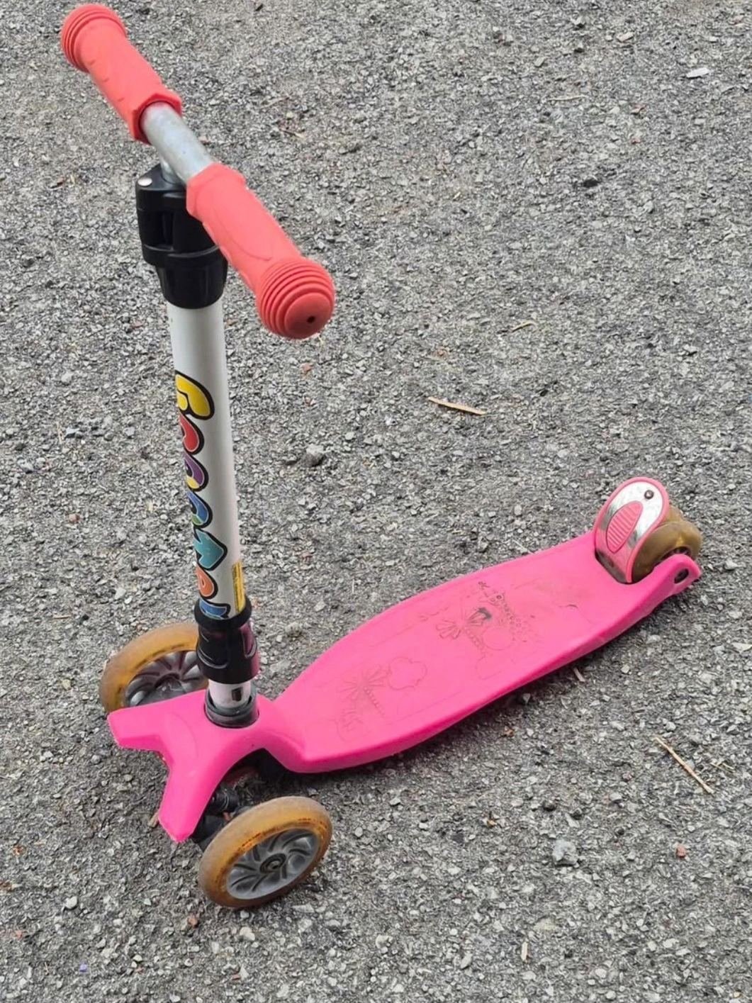 Selling a pink 3-wheel scooter. It has a colourful design on the stem and a pink footboard. The scooter shows signs of use, especially on the wheels, but it's still ready for some fun!