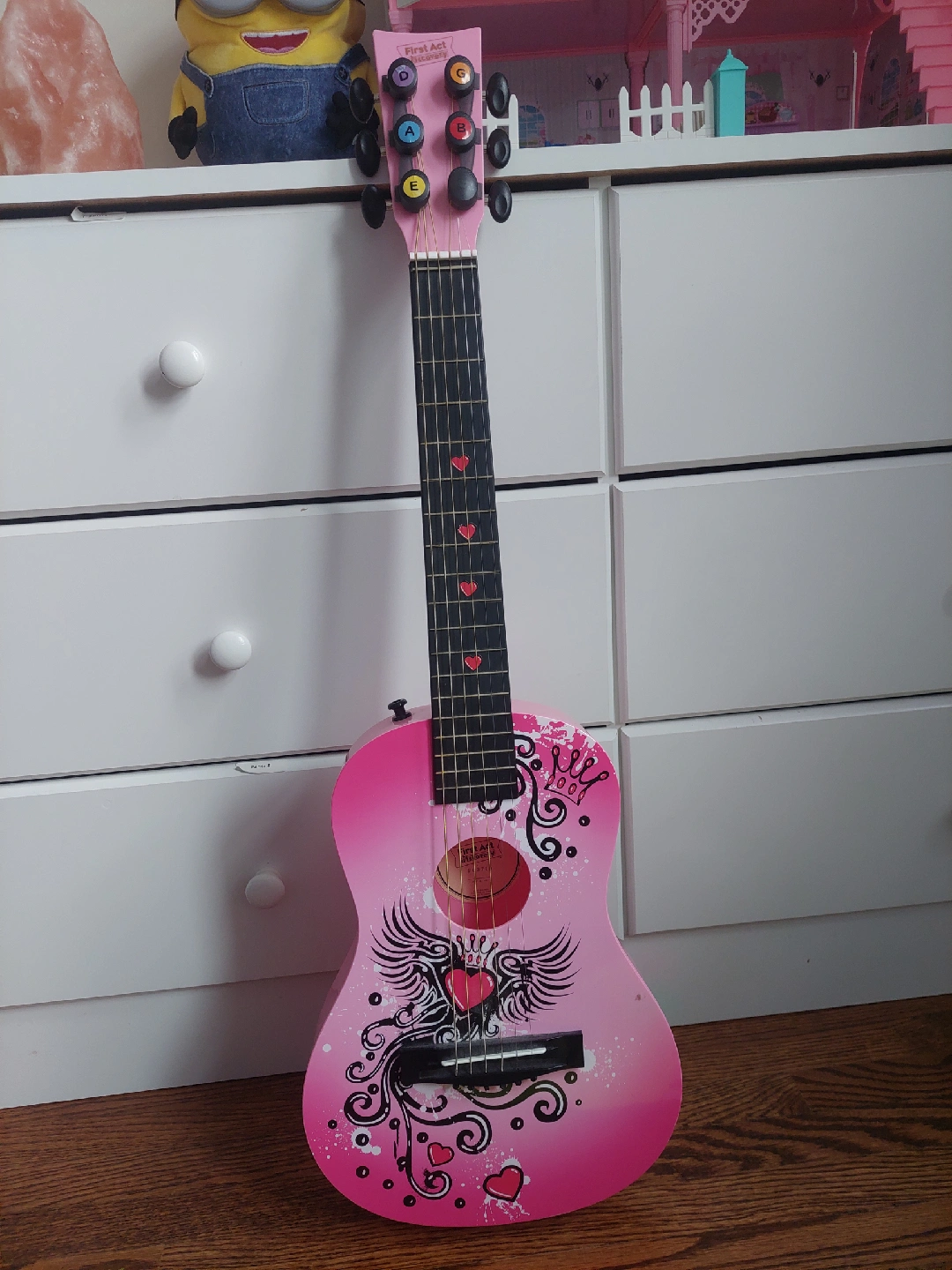 Selling a super cute acoustic guitar! It's pink and decorated with hearts, wings, and a crown design. Perfect for kids who are just starting to learn guitar