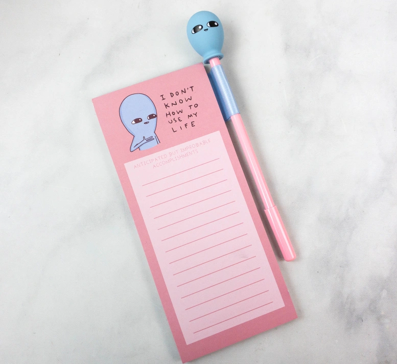 Cute notepad featuring strange planet! The notepad has the phrase "I don't know how to use my life" and "Anticipated but improbable accomplishments". Great for jotting down notes or to-do lists! The pen is a casualty of time, but the note pad is still in good shape