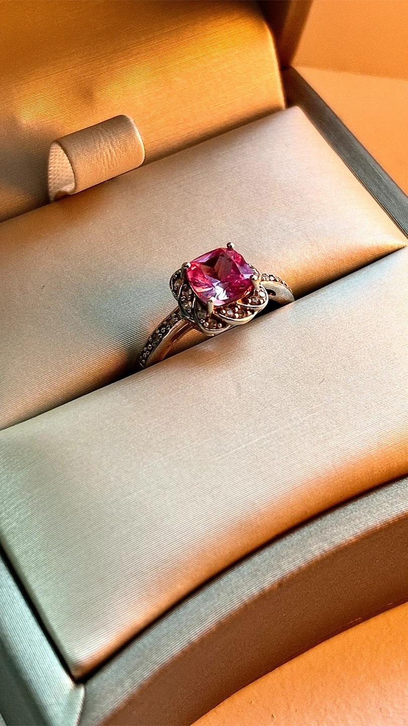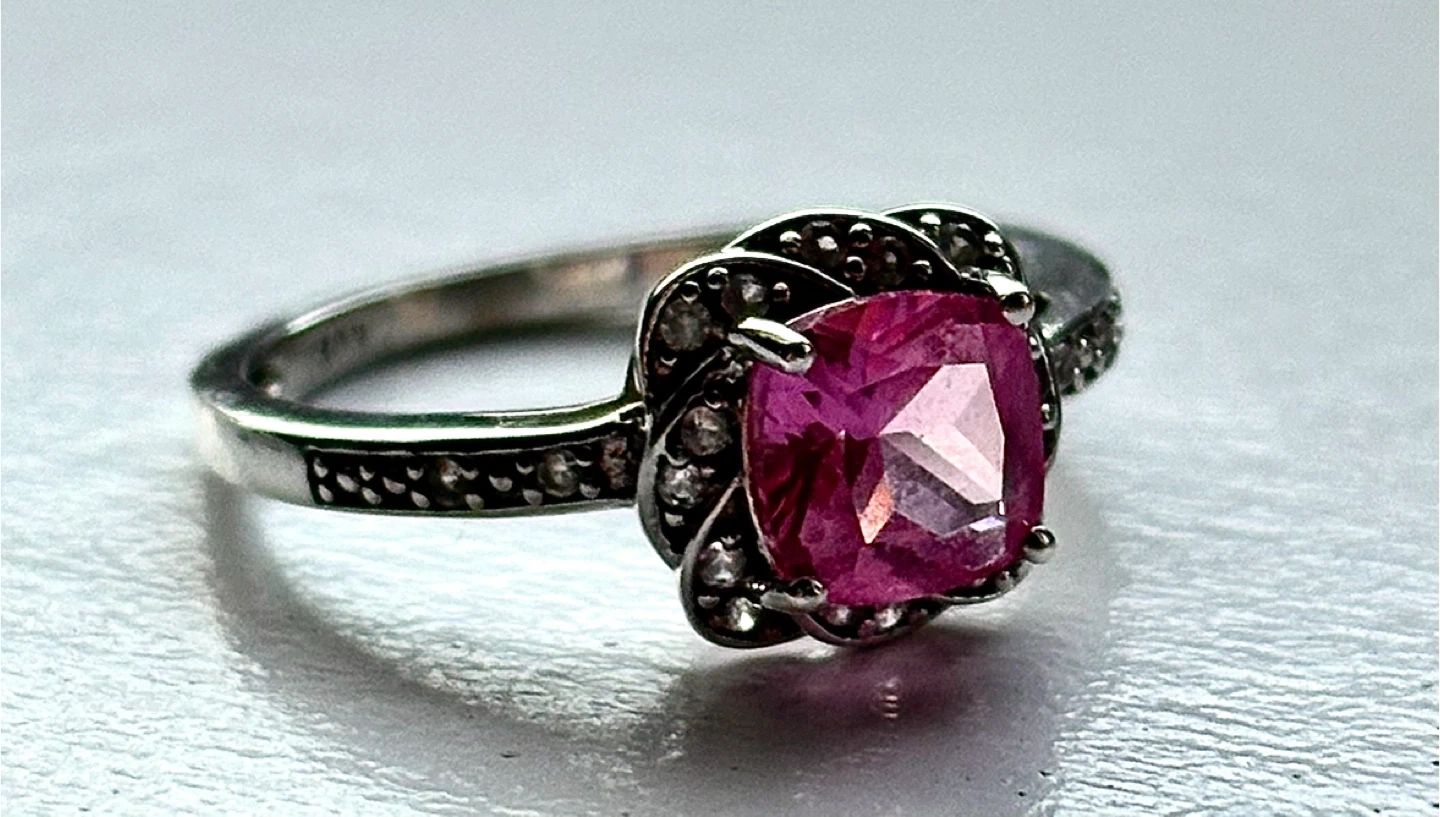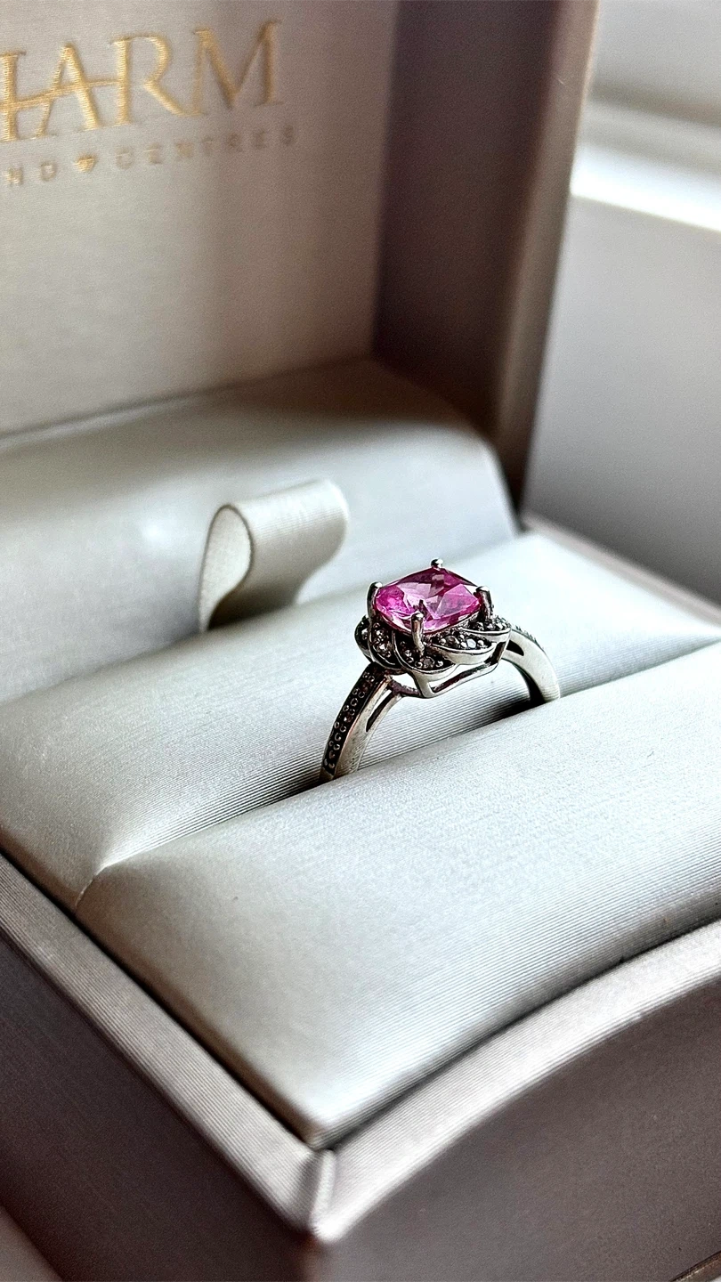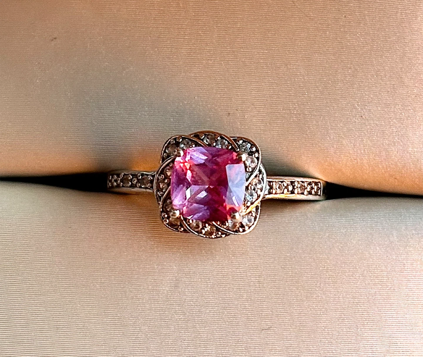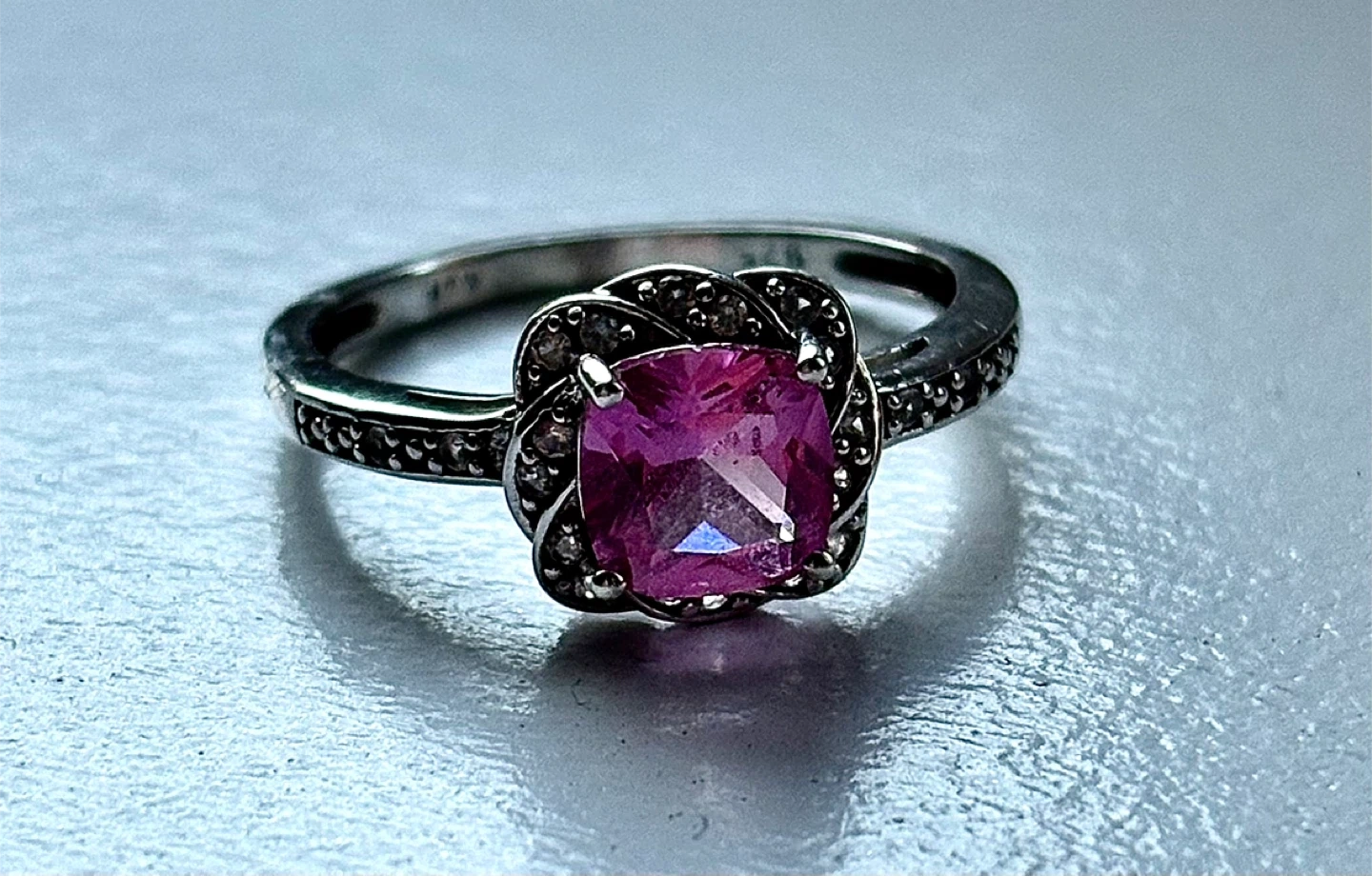 Promise ring with pink amethyst stone, complimented by diamonds set in a sterling silver band. Size 5.75. Lightly worn and in great condition. Half off original price. Wedding, relationship, jewelry, purple, cheap, discount, pretty, shiny, girlfriend, boyfriend, collection, collect, shine, gift