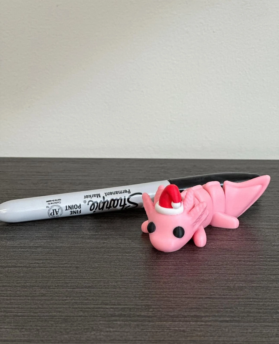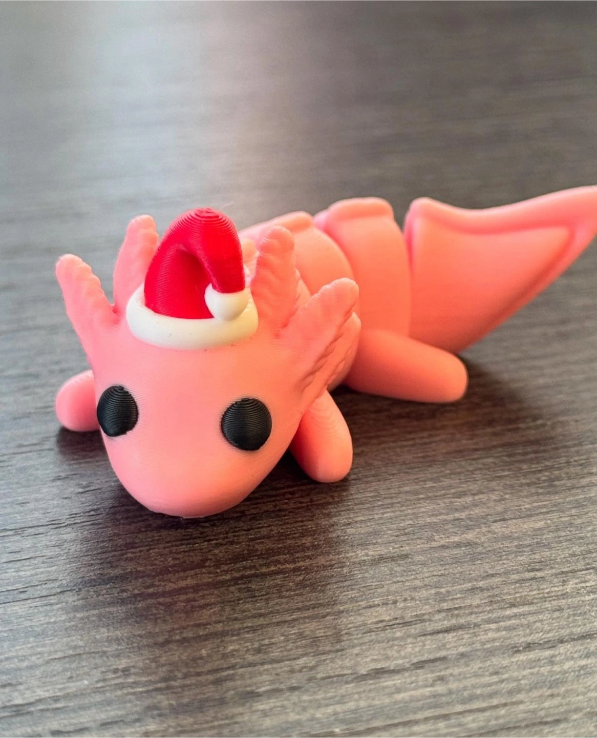 I'm selling a cute pink axolotl figurine! It's wearing a little Santa hat, perfect for the holidays. It would look great on a desk or shelf.