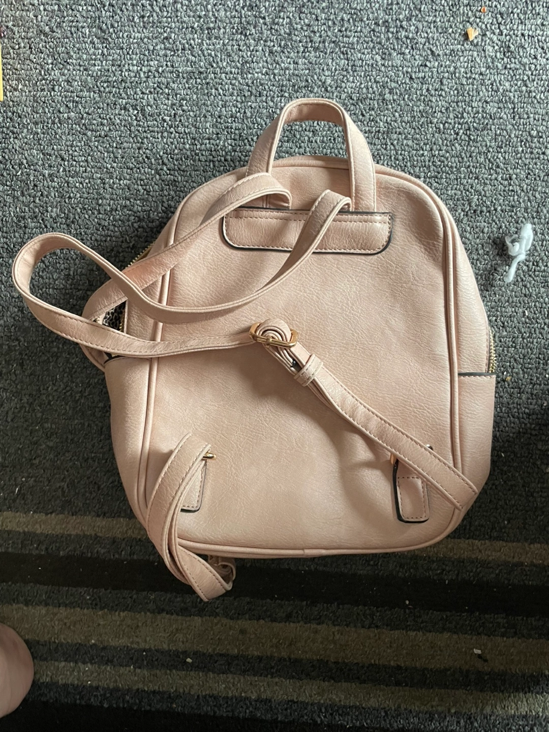 A cute pink backpack, perfect for everyday use! It features a front pocket and adjustable straps. The inside has a fun patterned lining