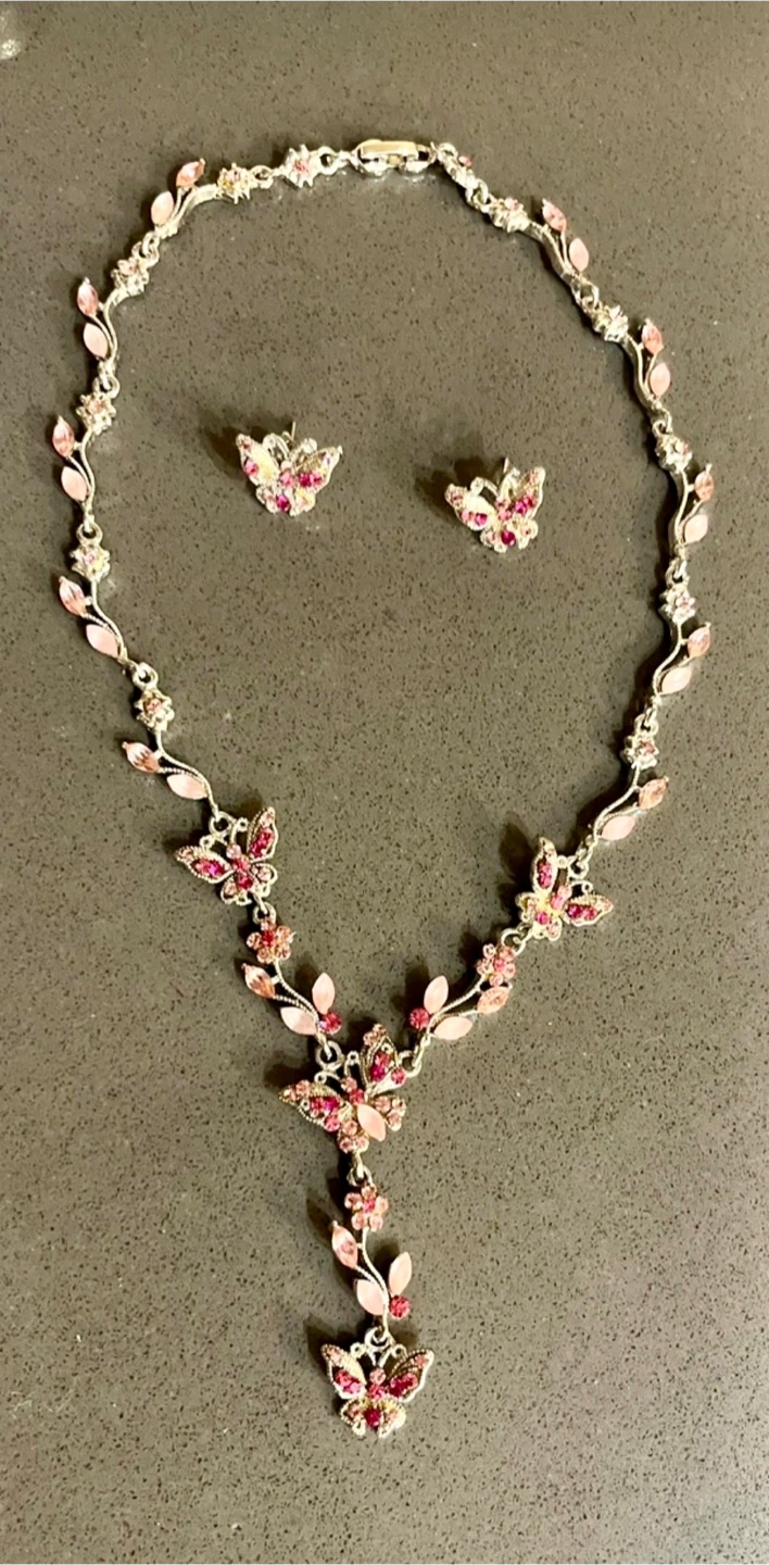 This is a cute necklace and earring set with a butterfly and floral design. The set is silver with pink accents and would be perfect for a special occasion or just to add a little sparkle to your day