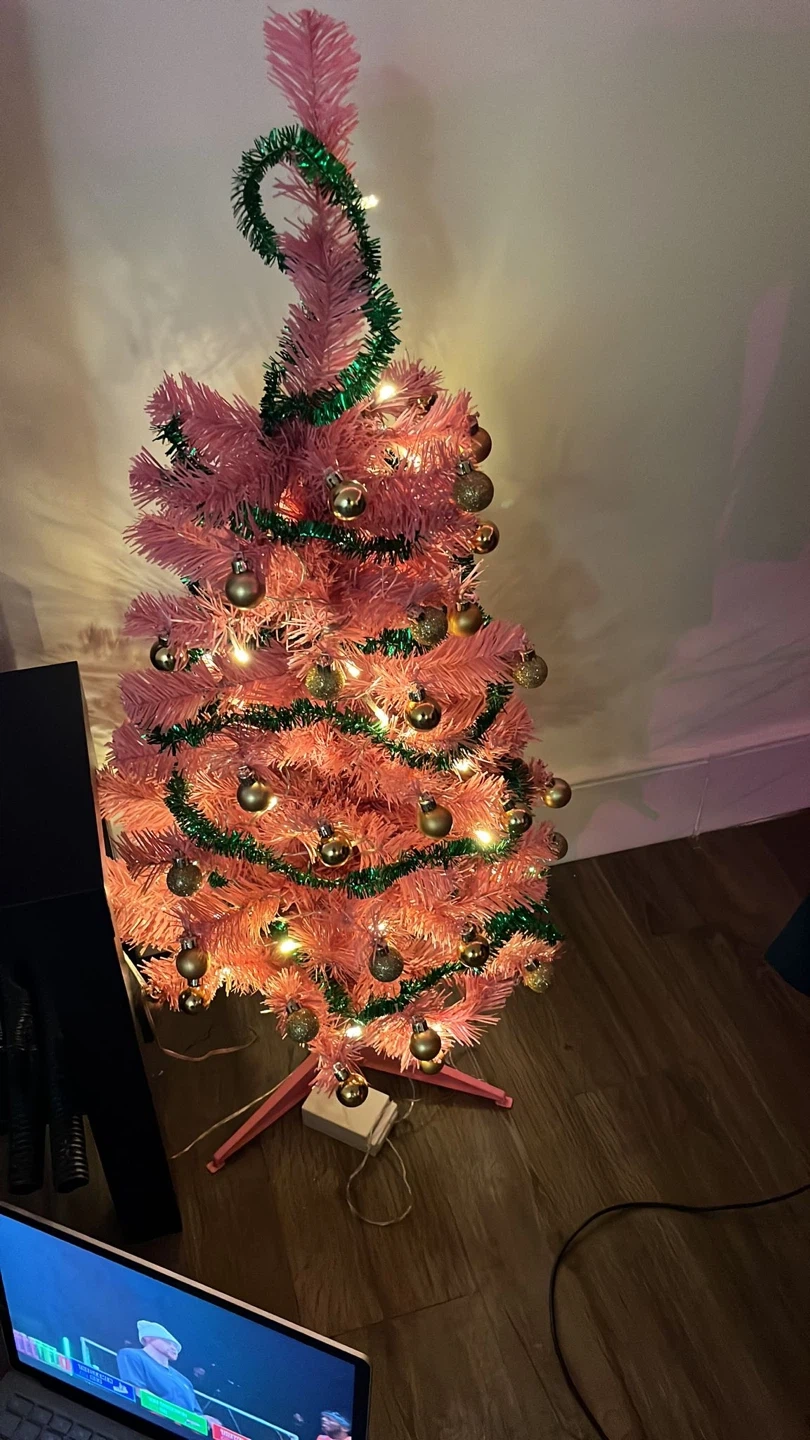 Selling a cute pink Christmas tree! It comes with gold ornaments but not the green tinsel