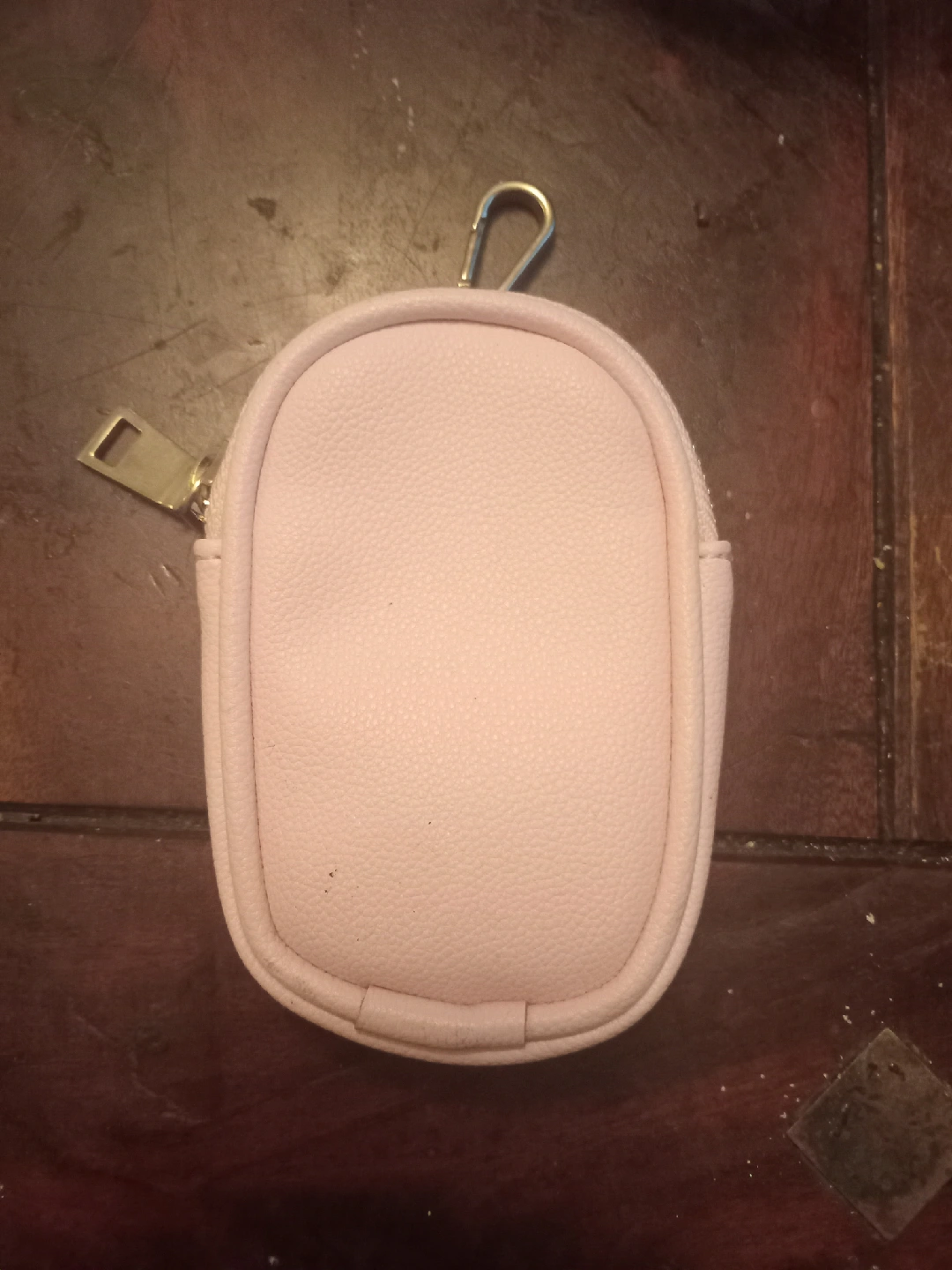A cute little pink coin purse with a clip! Perfect for holding your change, keys, or other small items. It has a zipper closure to keep everything secure and a clip to attach it to your bag or belt loop