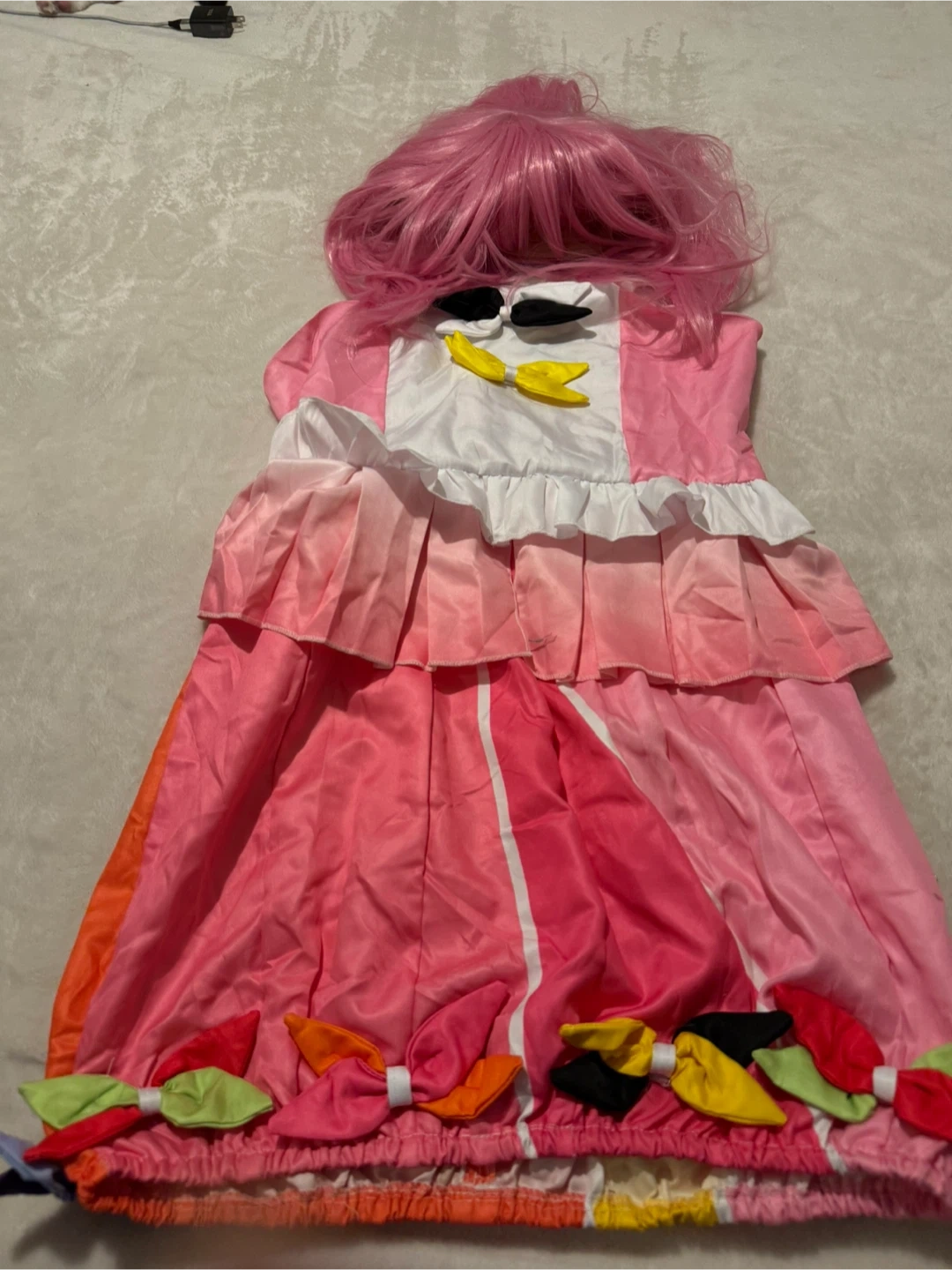 Selling a cute pink cosplay dress that comes with a matching wig! It's very colourful and has a fun design. Great for parties or events!