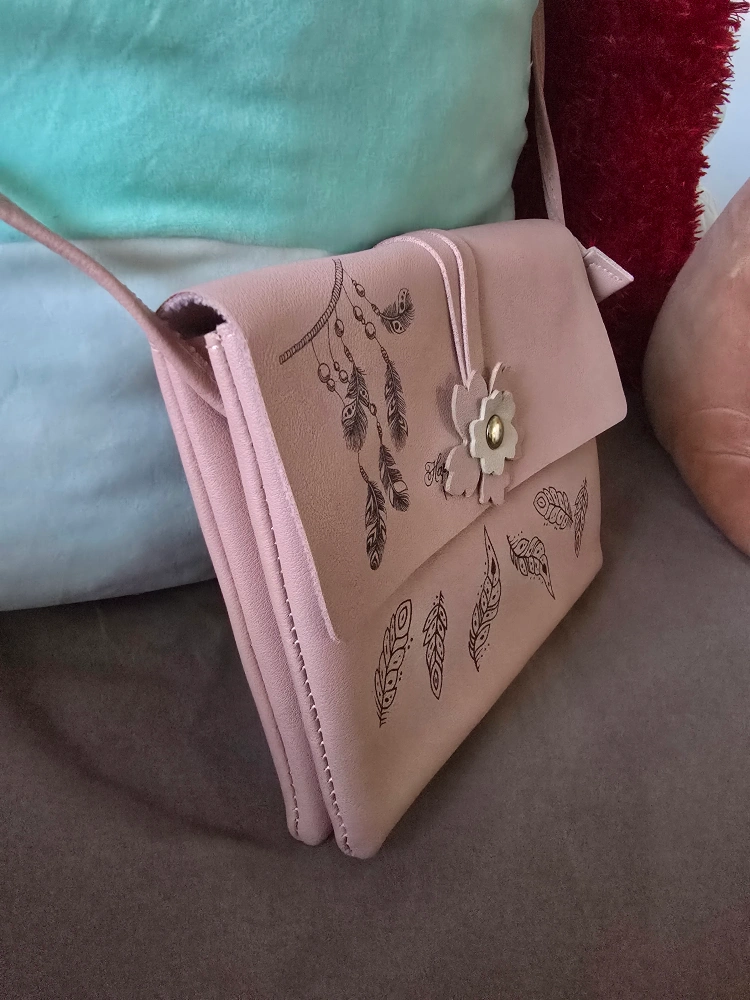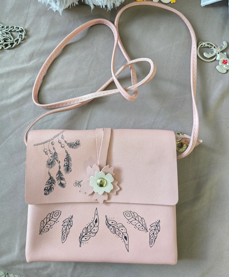 This is a cute pink crossbody bag with a unique feather design. It's perfect for carrying your essentials while adding a touch of style to your outfit. The bag features a flap closure with a decorative flower detail. It's new, never used.