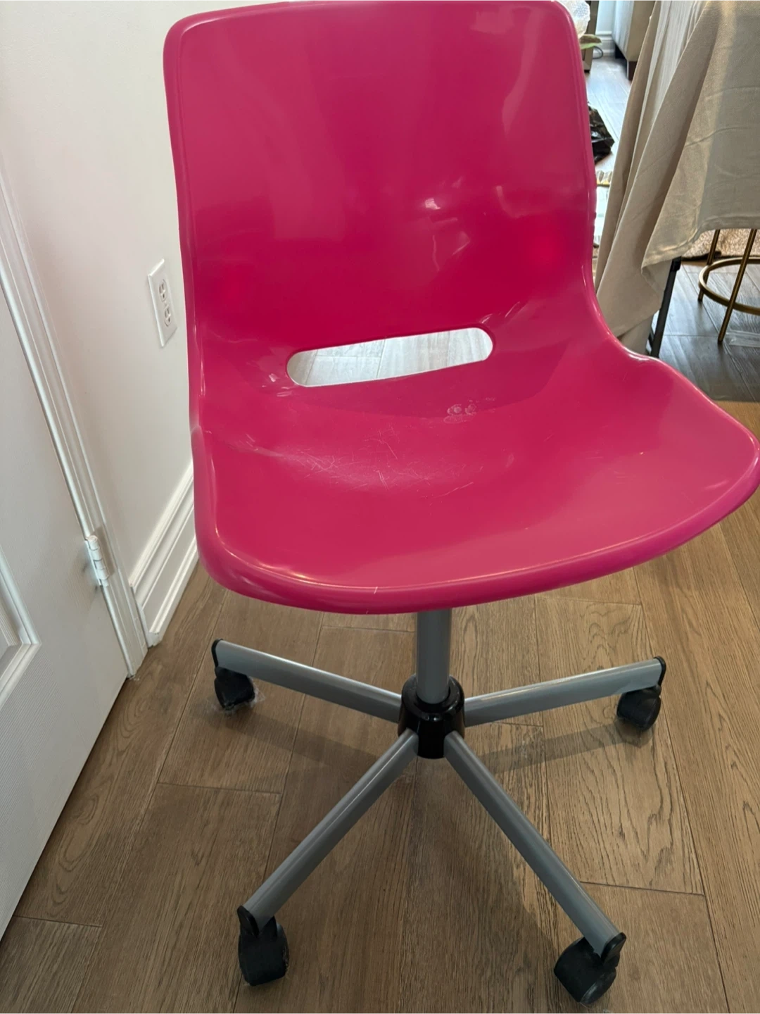 Selling a cute pink desk chair! It's perfect for a kid's room or a small workspace. The chair has a comfortable seat and back, and it rolls smoothly on its wheels. It does have some minor signs of use, but it's still in good condition and ready for a new home