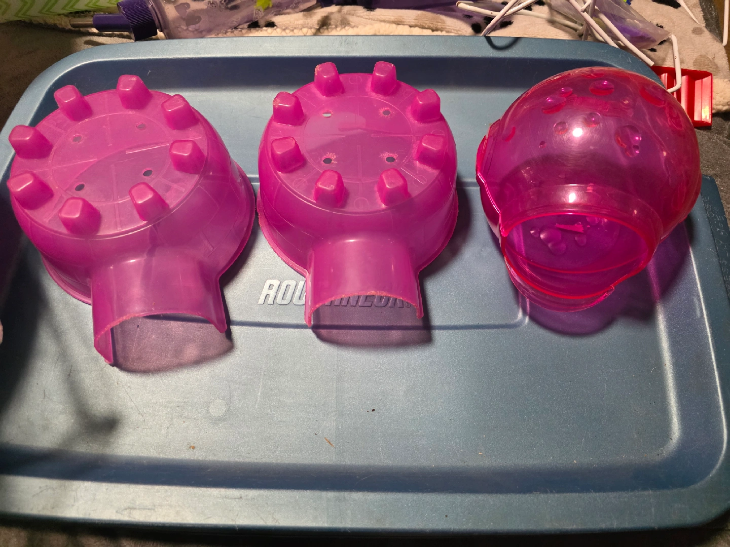 1 pink dome my mice chewed as seen reflected in the 2nd image. Other 2 in excellent condition. $5 for chewed one, $7 for the other two.