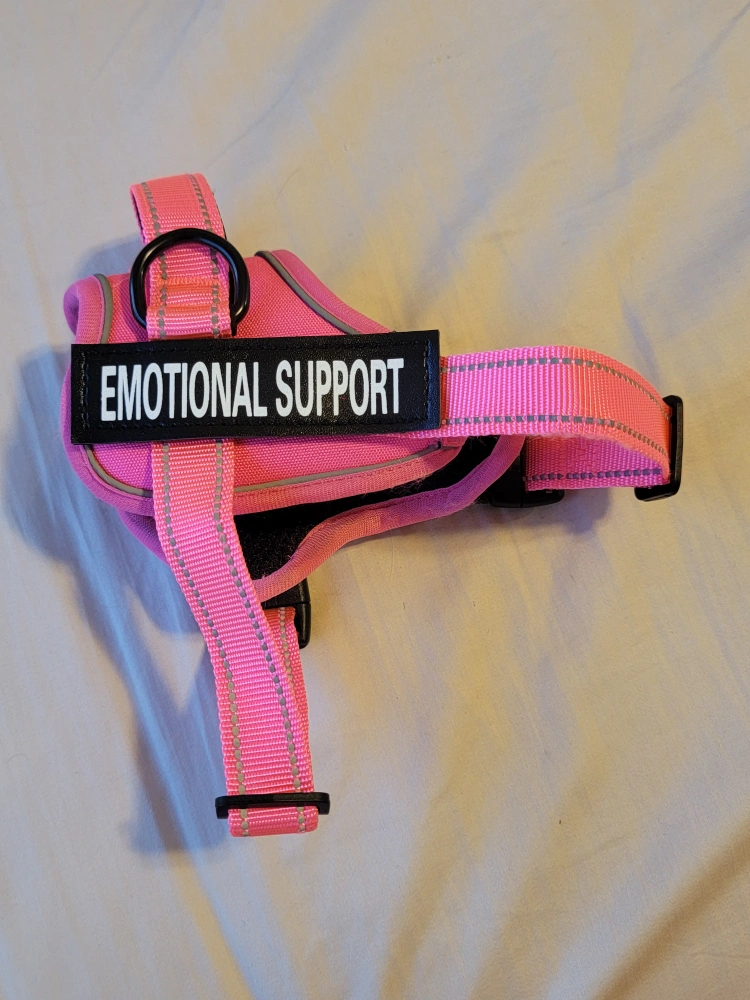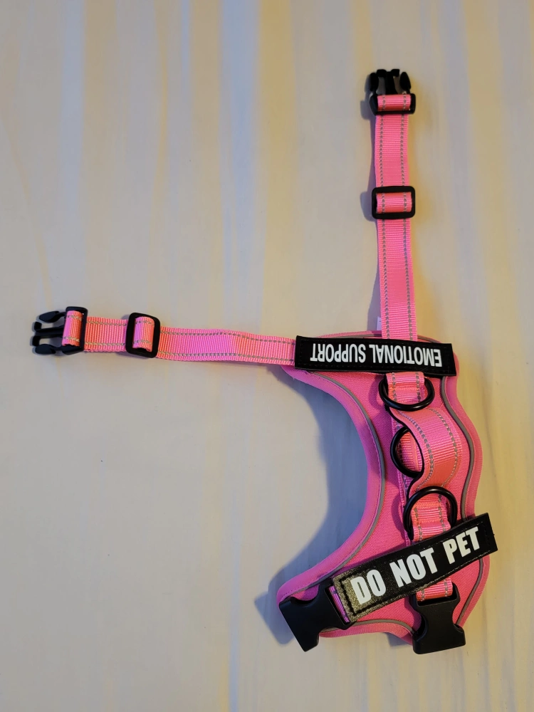 Size: XS (Chest: 13.5-18 Inch) Selling a bright pink dog harness, perfect for your emotional support animal! It's in great condition and features reflective stripes for added safety during walks. The harness has two patches: one that says "EMOTIONAL SUPPORT" and another that says "DO NOT PET". It's a size XS, so it's best suited for smaller dogs